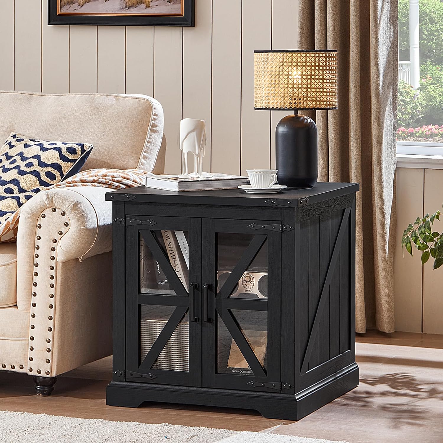 - 🏡[Functional Art Piece]The oversized end tables living room storage design provides convenient storage for your living space. The built-in shelves can be adjusted to 3 different heights as per your needs, accommodating an abundance of books, blankets, or coffee mugs. The glass barn-style doors blend traditional farmhouse aesthetics with a modern sensibility, transforming this piece into a more contemporary farmhouse night stand, coffee table, bedside table, or side-of-sofa art.