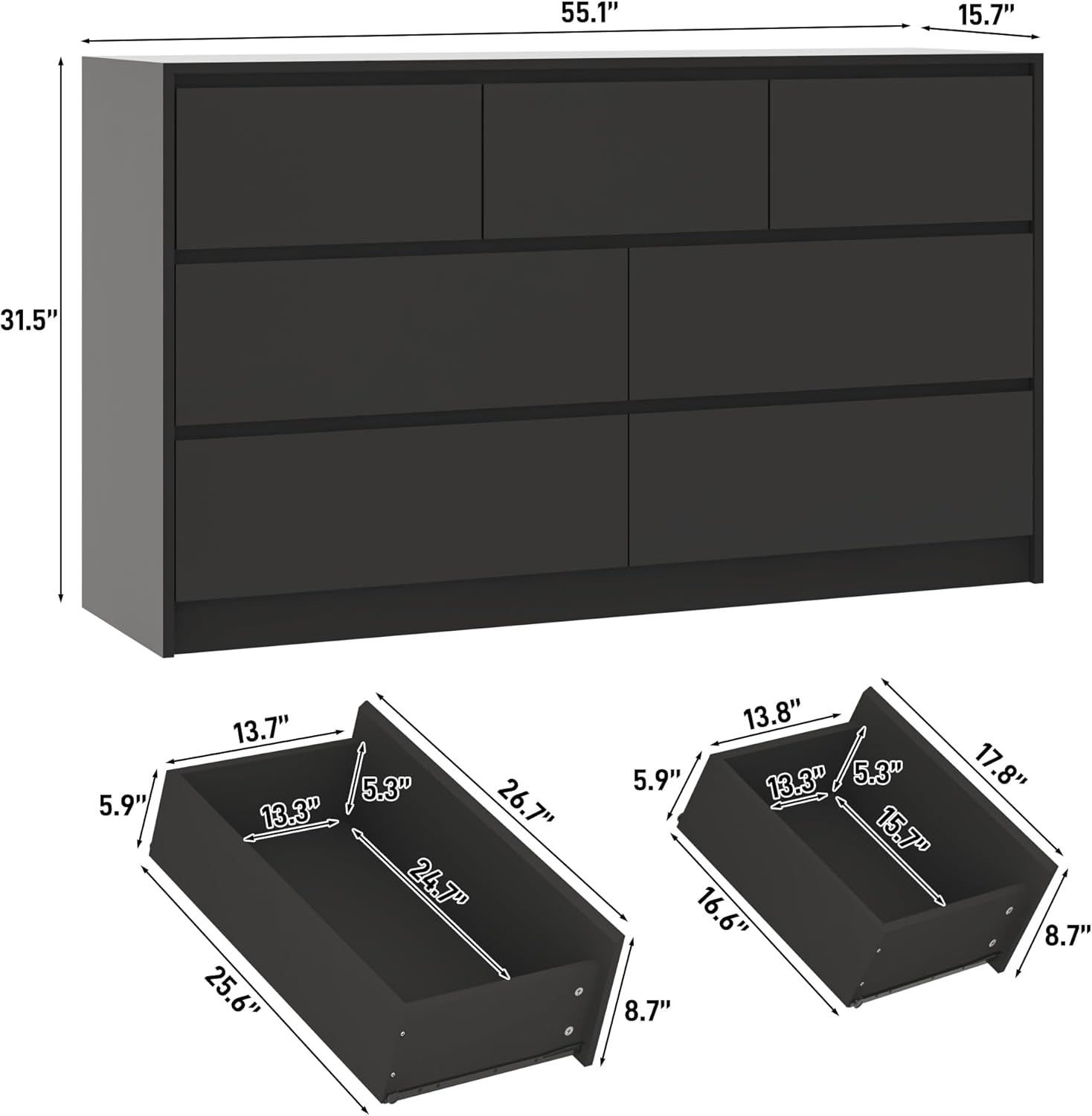 - ăGlossy handle-less designăDifferent from ordinary 55 inch long dresser for bedroom, our black 7 drawers malm dresser has a high-gloss front, adding a charming touch to your room. The unique beveled design of the drawers is full of modern elements. This large modern dresser with seven deep drawers can be matched with various themed homes.