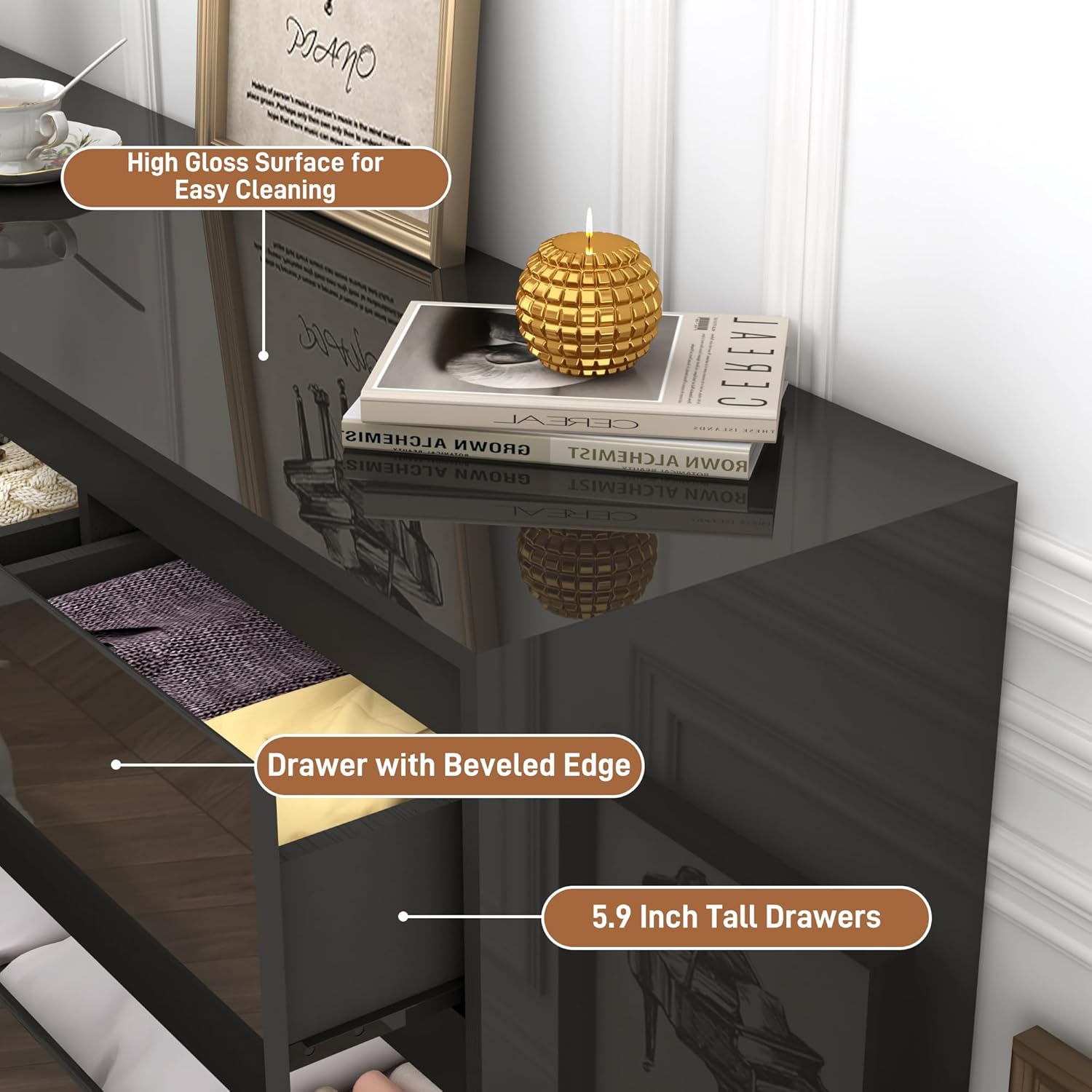 - ăThick and sturdyăThis black modern high gloss dresser is mainly composed of medium-density fiberboard material, which is stable. The retracted bottom base is waterproof and scratch-resistant, metal drawer slides for long-term use. Easy maintenance with just a damp cloth