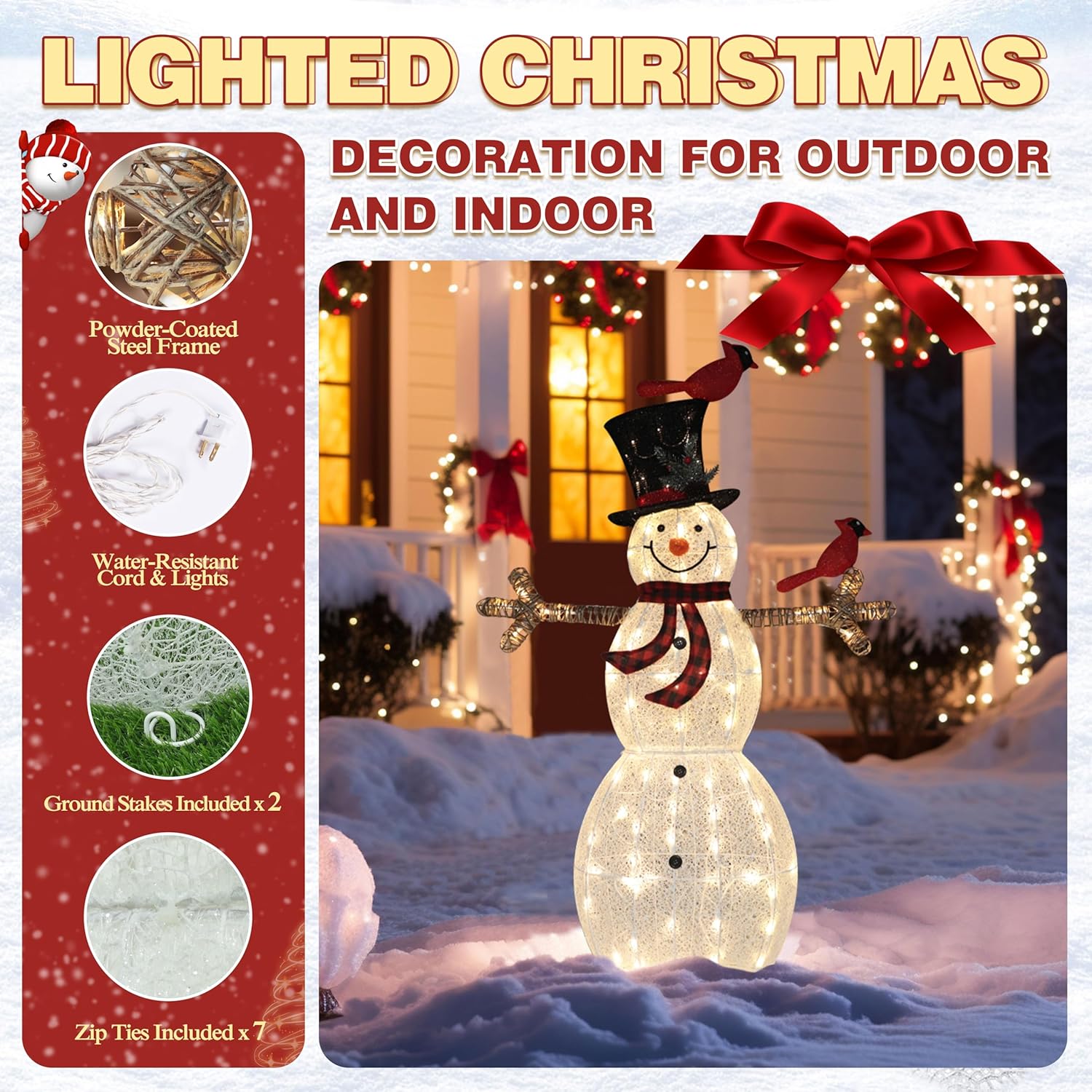 - [3D Pre-Lit Snowman] This light up Christmas snowman decoration is a 3D yard shape which is wearing a Christmas hat with red birds and a scarf. They are opening arms to welcome your family and friends with sincere smile. The 3D design makes the snowman looks more vivid as a indoor or outdoor Xmas Decor.