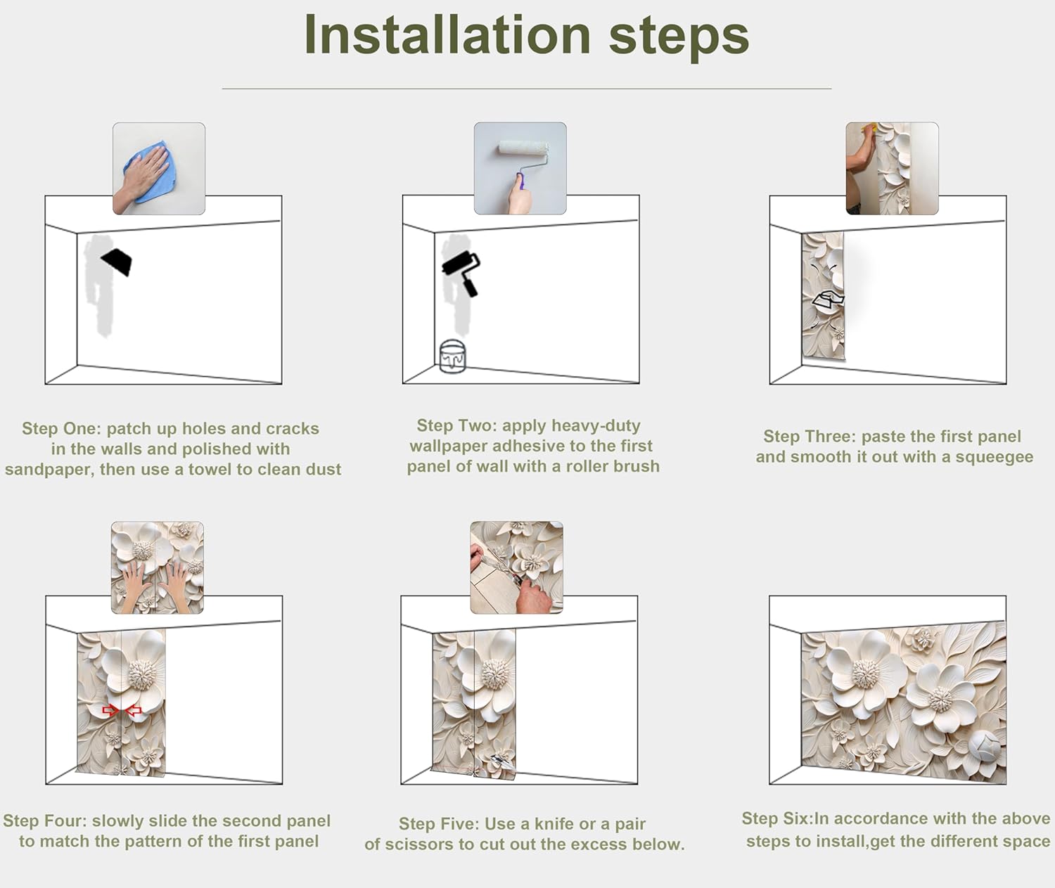 - INSTALLATION - 1.Fill in all cracks or holes and clean dust dirt and grease on the wall surface. 2. Apply the heavy duty wallpaper paste on the wall not mural. 3. Use a spirit level to mark first strip location. 4. match the pattern by sliding into place. 5.use a scraper to smooth out bubbles press. 6. Let dry for a few minutes and that's it! Please Note: Not self-adhesive. We recommend to use a standardized fleece wallpaper paste.