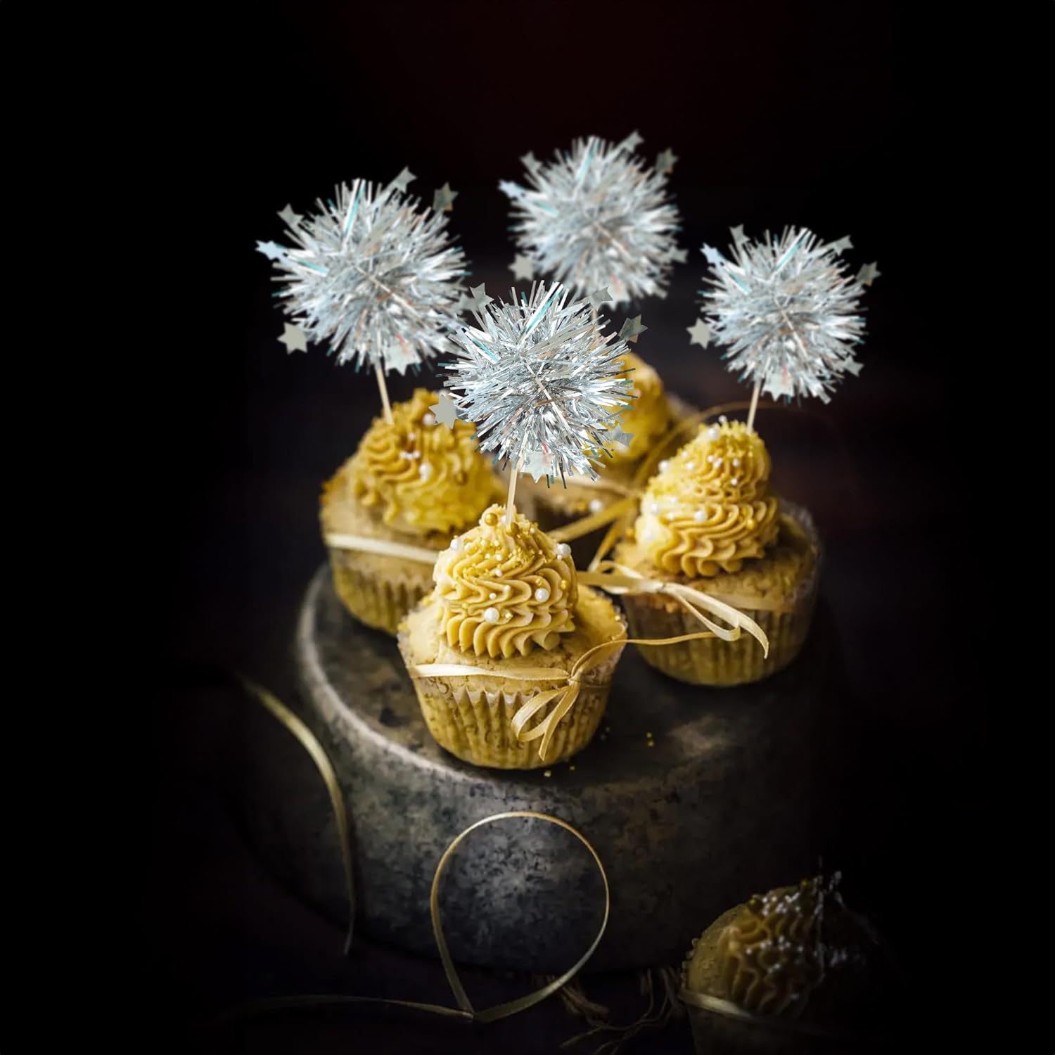 Ephlyn 30Pcs Foil Firework Cupcake Toppers Party Birthday Cake Toppers Supplies Sparkle Tinsel Cocktail Fruit Toothpick for Birthday Wedding Graduation Party Silver