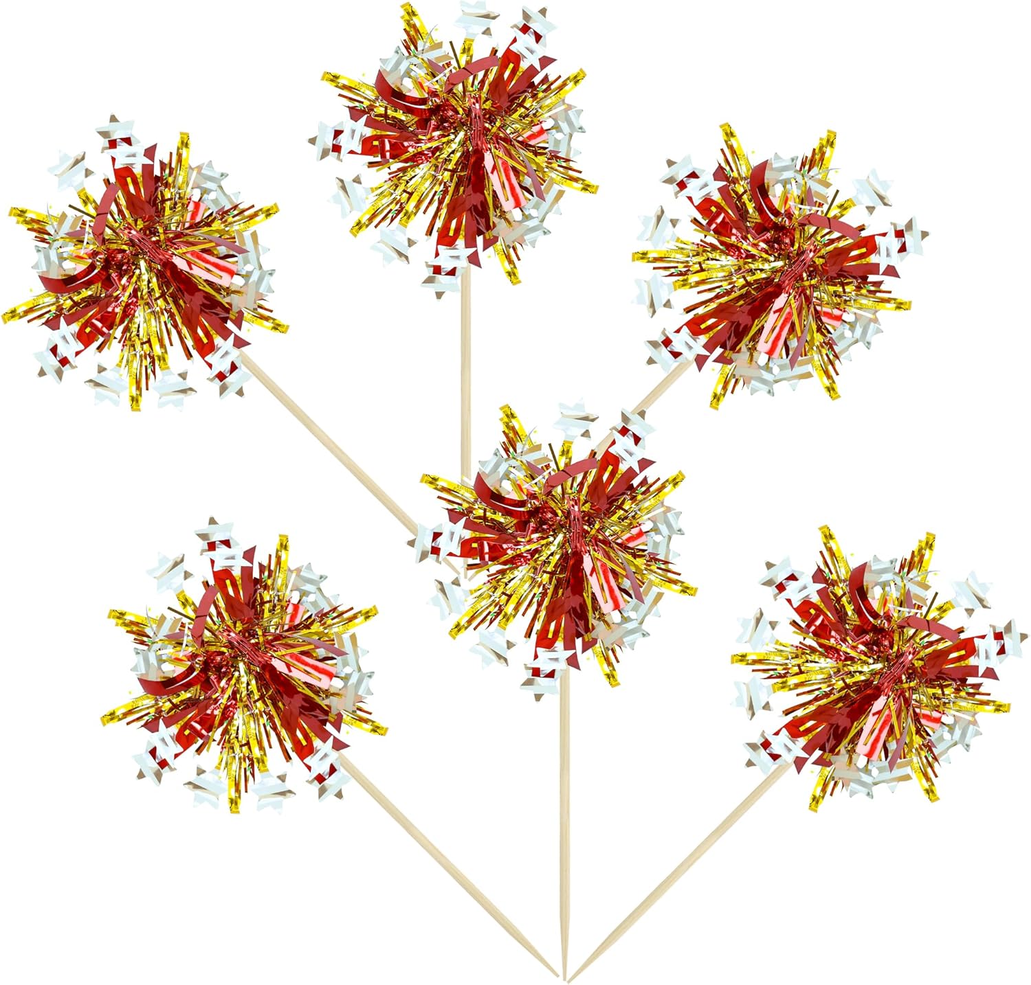 Ephlyn 30Pcs Foil Firework Cupcake Toppers Sparkle Tinsel Cupcake Picks Happy Birthday Cake Decorations Drink Stirrers Cocktail Food Fruit Toothpicks for Baby Shower Graduation Party Supplies Gold Red