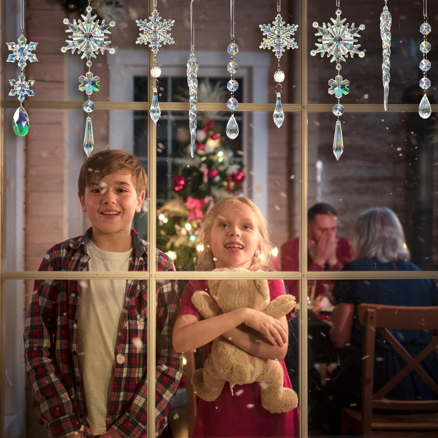 - EASY TO USE: Each crystal snowflake and icicle pendant ornament comes with a built-in rope for effortless hanging. Simply thread the rope through the included hooks or hang them directly from tree branches, door frames, or ceiling hooks. The convenient hanging design makes decorating a breeze and ensures your ornaments stay securely in place, whether on Christmas tree, doors, walls, or windows