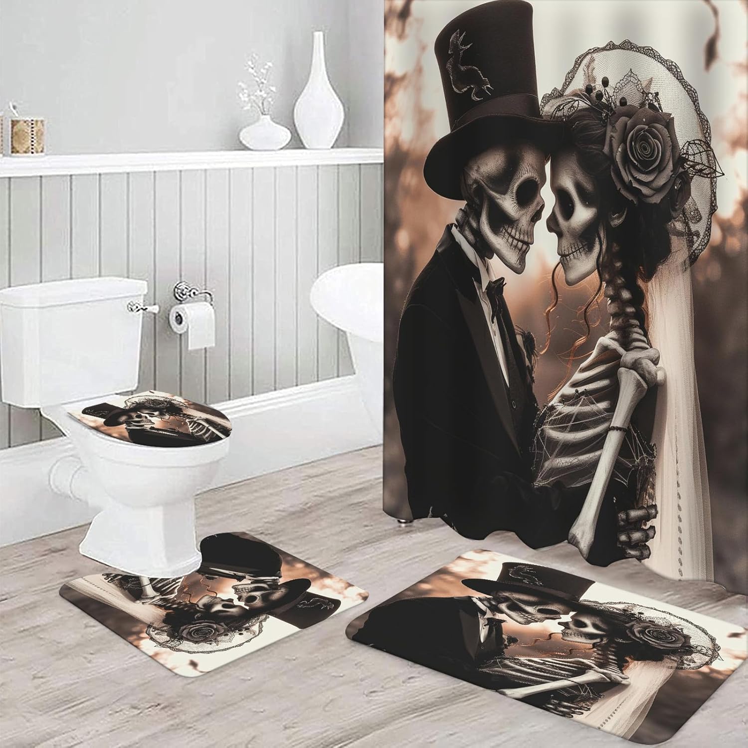 NEWSUYAA Halloween Decorations Shower Curtain Set with Non-Slip Rugs and Bath Mats,Black Skull Skeleton Bathtub Curtains with 12 Hooks,All Saints'Day (Nov 1st) Bathroom Decor