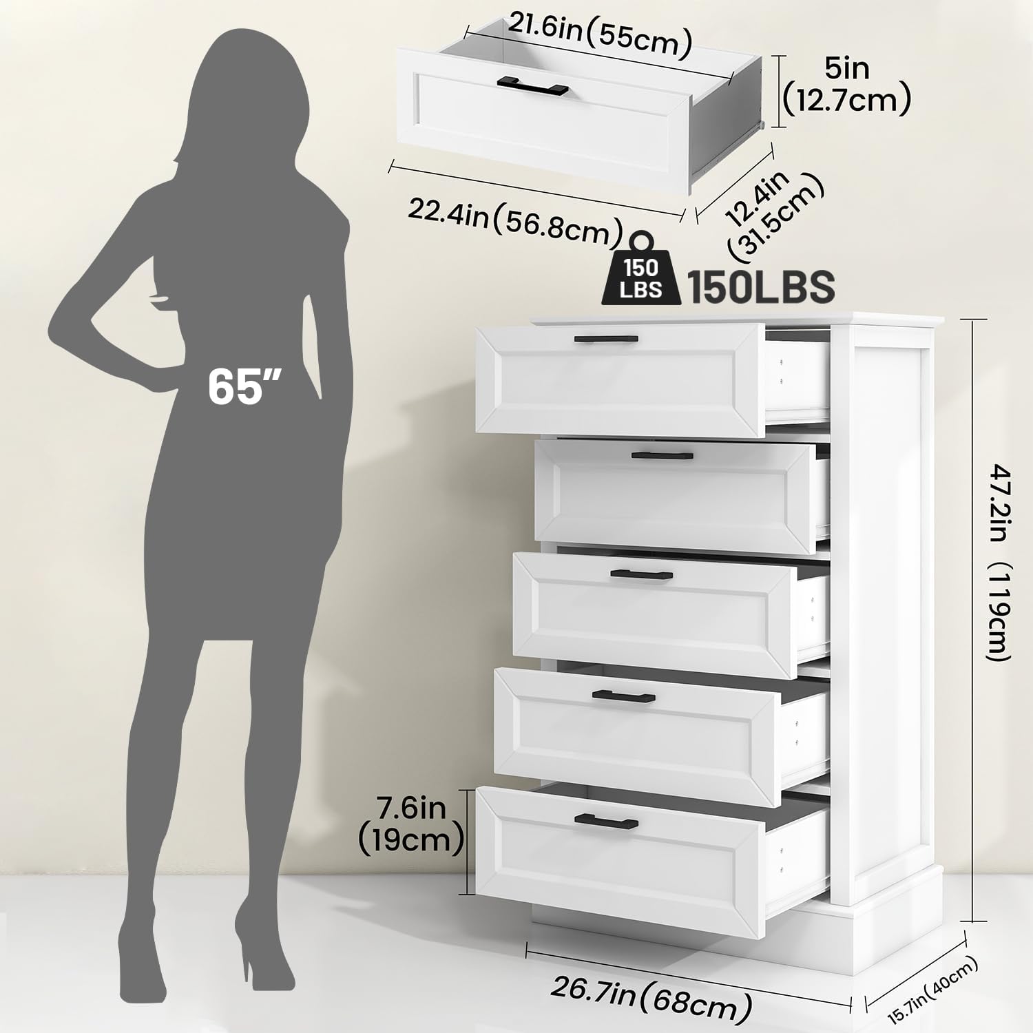 - Spacious Storage: 28.7”W x 15.7”D x 47.2”H. The wooden white dresser features 6 deep drawers (22.4”W x 12.4”D x 5”H) for ample storage space. Perfect for clothes, stocking, blankets, toys and more.