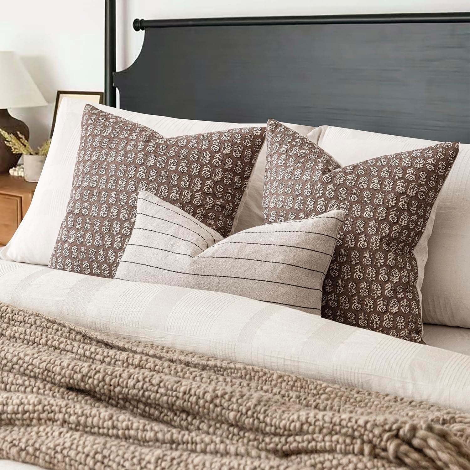 Foindtower Set of 2 Decorative Neutral Floral Print Throw Pillow Covers Vintage Accent Farmhouse Cushion Covers Boho Home Decor for Sofa Couch Chair Bedroom Living Room Outdoor,22×22 Inch,Brown
