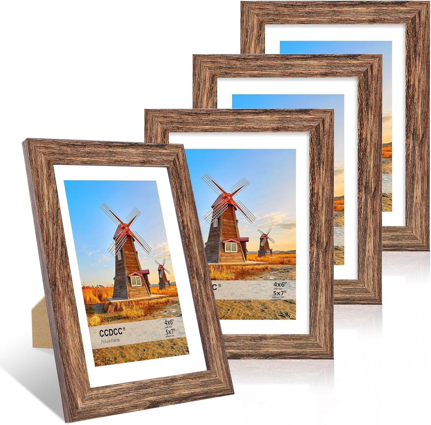 5x7 Picture Frame Set of 4, 5 x 7 Wood Photo Frames with Mat for 4x6, Natural Wooden Frame with Real Glass Cover for Wall and Tabletop Display,Rustic Brown