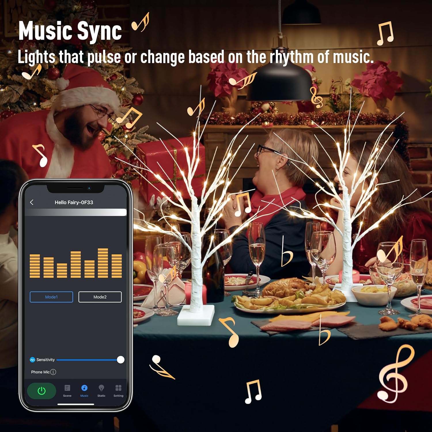 - SET SCHEDULE, TIMER, COUTDOWN: Automatically turn on/off this lighted Christmas trees, by setting a specific time on the Hello Fairy App. The smart lighted brich tree can also automatically synchronize to the sunrise and sunset to preset time.