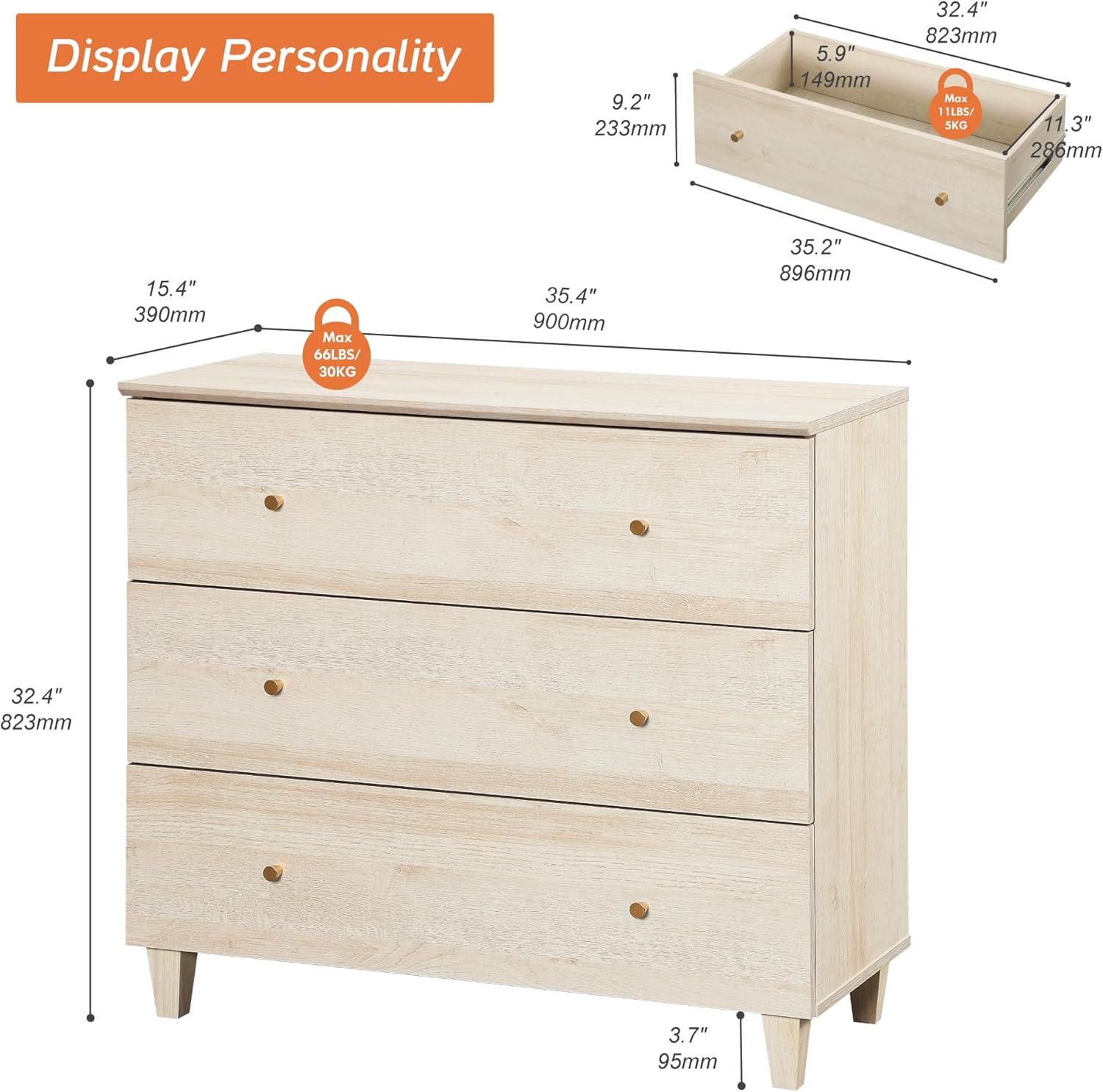 WAMPAT Bedroom Dresser with 3 Drawers, 35.4" Wide Wood Kids Dressers, Chest of Drawers, Modern Closet Organizer Bachelors Chest w/Solid Wood Legs for Living Room, Baby Room, Nursery, Light Oak