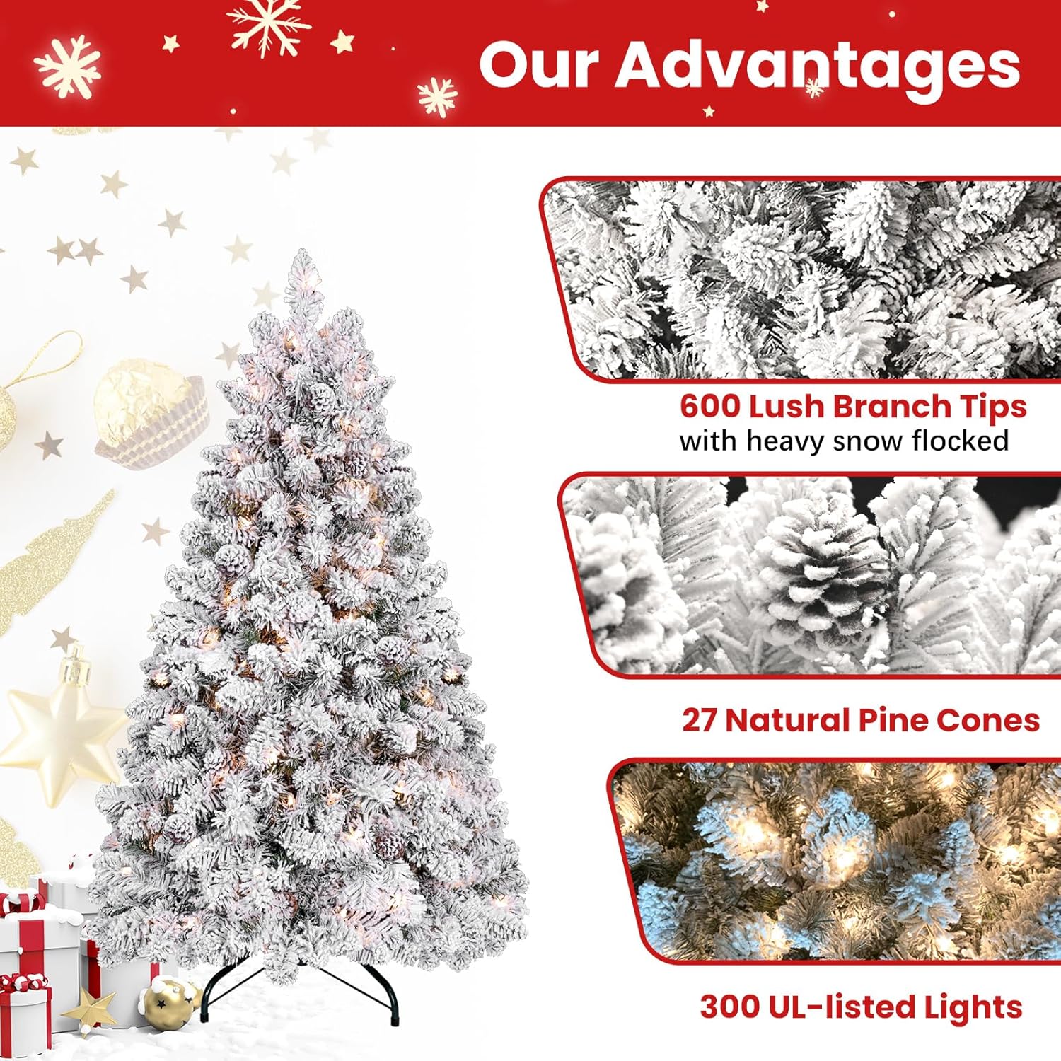 5ft Pre-lit Flocked Christmas Tree, Artificial Christmas Tree with Lights, Snow Frosted Christmas Trees Pre-lit with Pine Cones & 300 UL Lights, 600 Tips, Hinged Easy Setup Xmas Tree