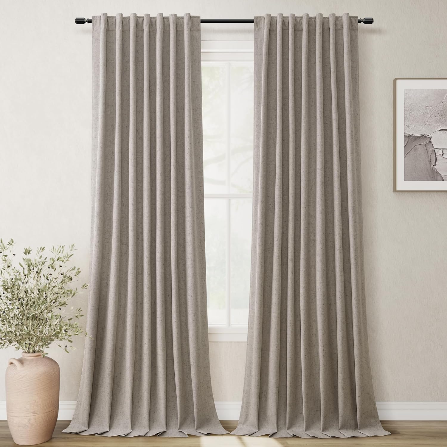 108 Inch Black Out Curtains 2 Panels Set Back Tab Thermal Insulated Natural Linen Textured Blackout Curtains Noise Reducing Dark Taupe Neutral Living Room Darkening Window Drapes Pleated 52x108