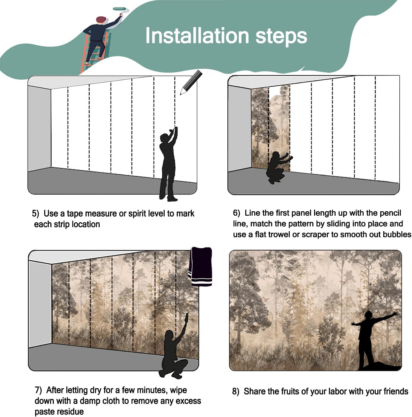 - Mural wallpaper size: 140 "W x 91 "H, divided into 7 sections, each section is labeled with a number underneath, there is no need to overlap the pattern when installing, just install according to the number labeled underneath the panel