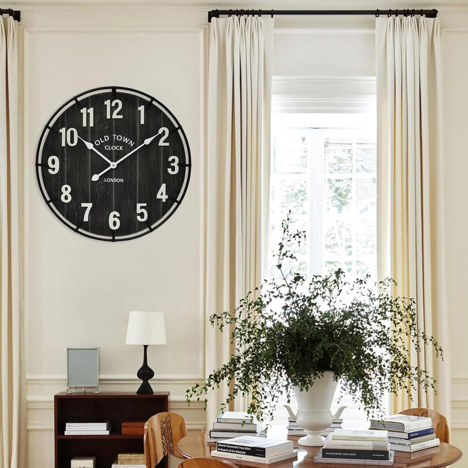 Large Old Town Farmhouse Wall Clock – 24 Inches Rustic Antique Wood with Metal Circle and Large Numerals, Silent Battery Operated Clock for Office, Kitchen, Bedroom, Living Room (Black)