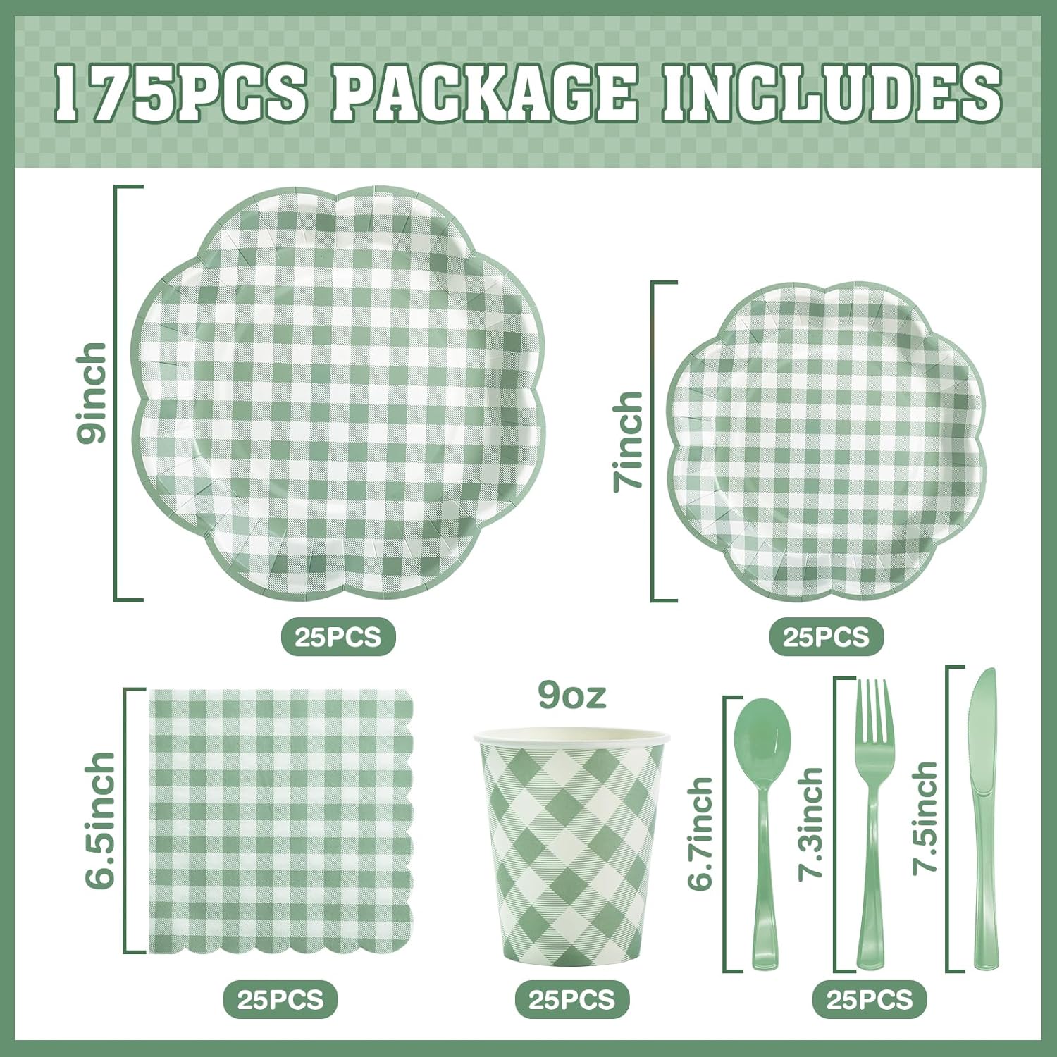 - ăServes 25 GuestsăSage green gingham plates sets includes 25pcs 9-inch sage green checkered dinner plates, 25pcs 7-inch sage green plaid dessert plates, 25pcs 9 oz gingham cups, 25pcs 6.5-inch scalloped gingham napkins and 25 sets of knives, forks, spoons for a total of 175 pieces. Perfect for all kinds of parties and celebrations