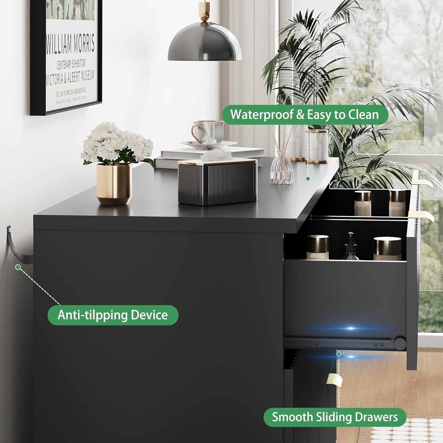 - ăStability & SafetyăThe white/black/natural oak dresser is equipped with an anti-tipping device, which can be fixed on the wall to prevent accidents. Each drawer contains a wide metal handle and built-in slide rail, easy to push and pull. Besides, the sturdy base provides this dresser with drawers a strong support and the middle feet can be adjustable to keep balance on uneven floors
