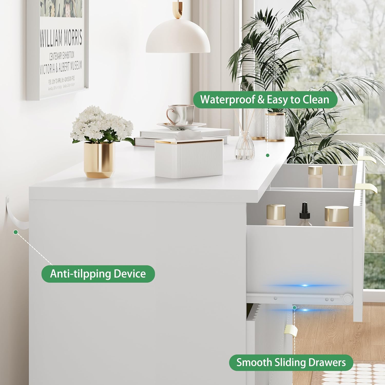 - ăStability & SafetyăThe white/black/natural oak dresser is equipped with an anti-tipping device, which can be fixed on the wall to prevent accidents. Each drawer contains a wide metal handle and built-in slide rail, easy to push and pull. Besides, the sturdy base provides this dresser with drawers a strong support and the middle feet can be adjustable to keep balance on uneven floors
