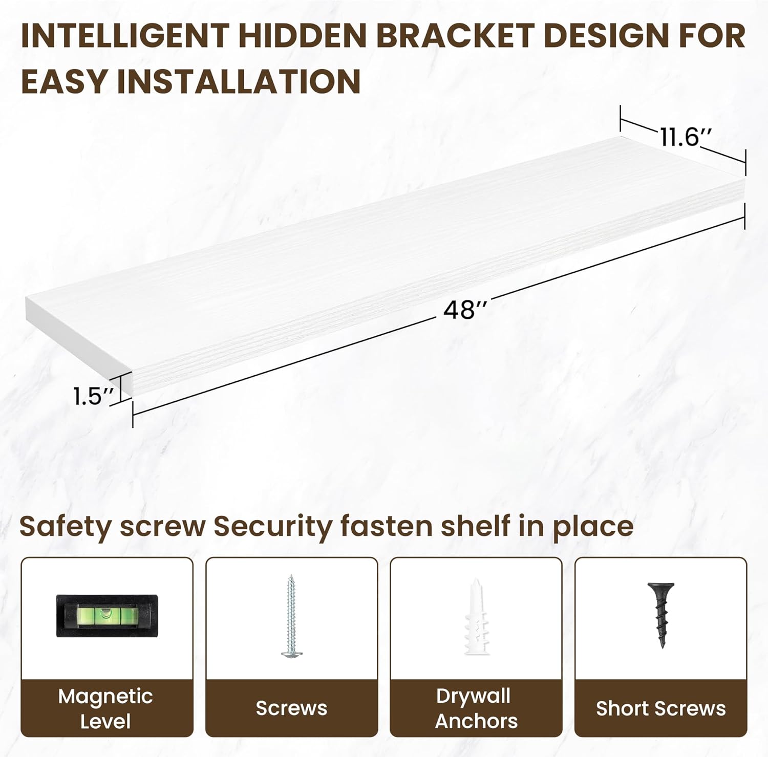 48 Inch Floating Shelves, 12 Inch Deep Floating Shelves for Wall, Floating Shelf with Invisible Brackets, Deep Wall Shelves for Bathroom, Bedroom, Living Room, 1 Pack, White