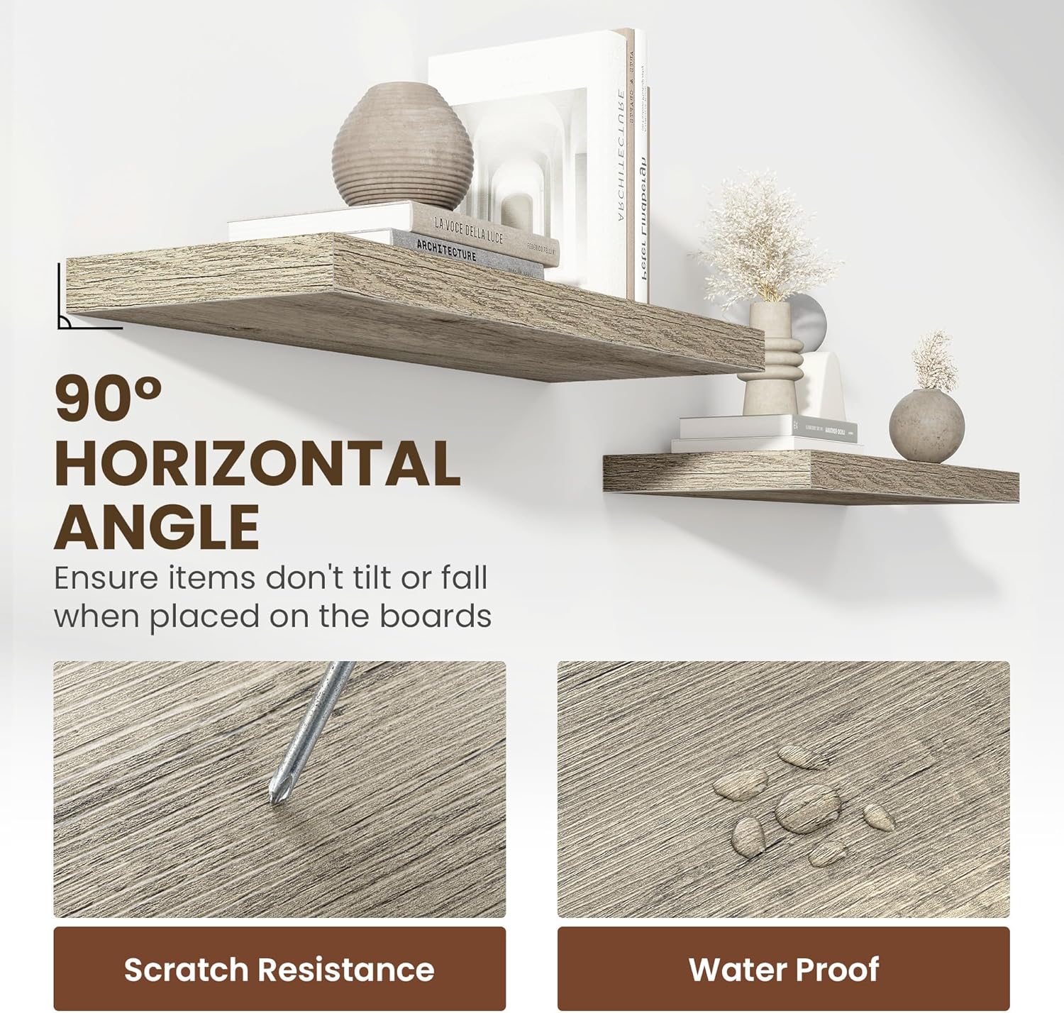 - ăPremium Quality ConstructionăCrafted from high-grade engineered wood with an invisible one-piece bracket, these floating shelves offer a robust and sleek design. The rustic wooden grain finish not only adds a touch of elegance but also infuses warmth into any room, making them a perfect fit for both modern and traditional interiors.