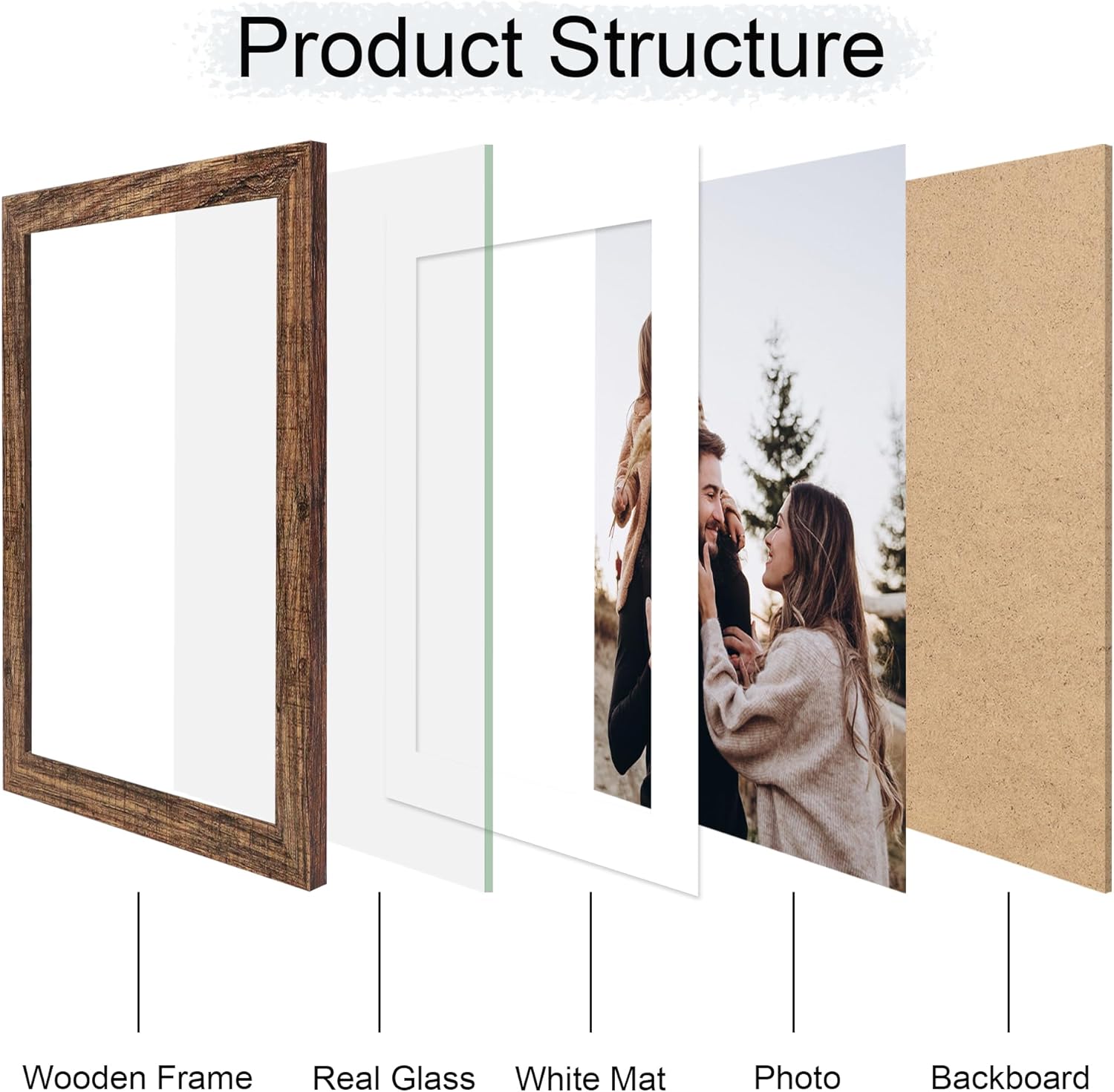 10x14 Picture Frame Set of 4, 10 x 14 Wood Photo Frames with Mat for 8x12 or 30x40cm Diamond Painting Art, Wooden Frame with Real Glass Cover for Wall and Tabletop Display,Rustic Brown