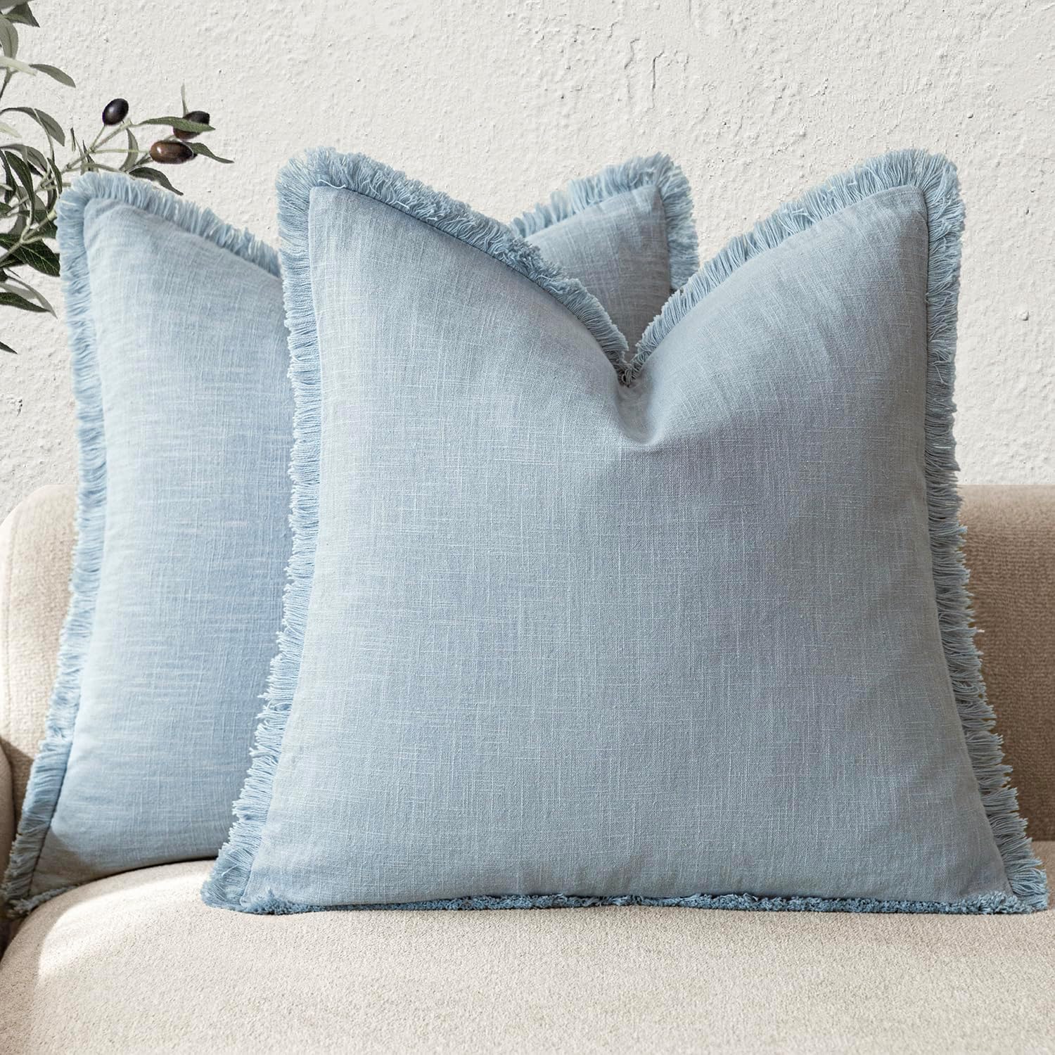Foindtower Set of 2 Decorative Linen Fringe Throw Pillow Covers Boho Farmhouse Cushion Cover with Tassels Soft Accent Pillowcase for Couch Chair Sofa Bed Living Room Home Decor,22×22 Inch,Sky Blue