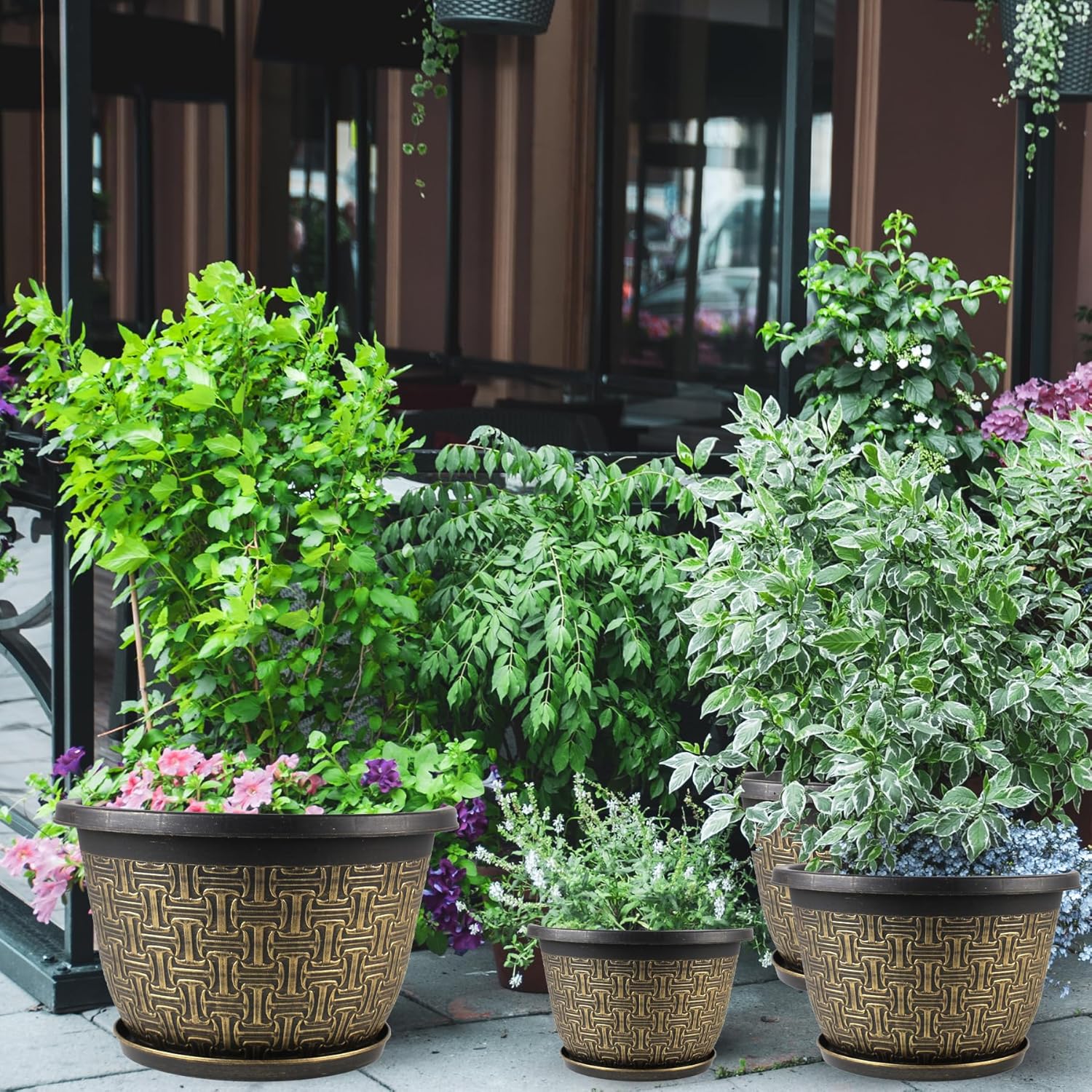 - 【WEATHER RESISTANT】Our Planters pots for plants are made of sturdy recyclable plastic. Allow you to enjoy these flower pots outdoor in all types of weather. Built to withstand intense sun and harsh winter temperatures, free from fade, frost, crack and peel damage so you can use it indoors and outdoors freely.