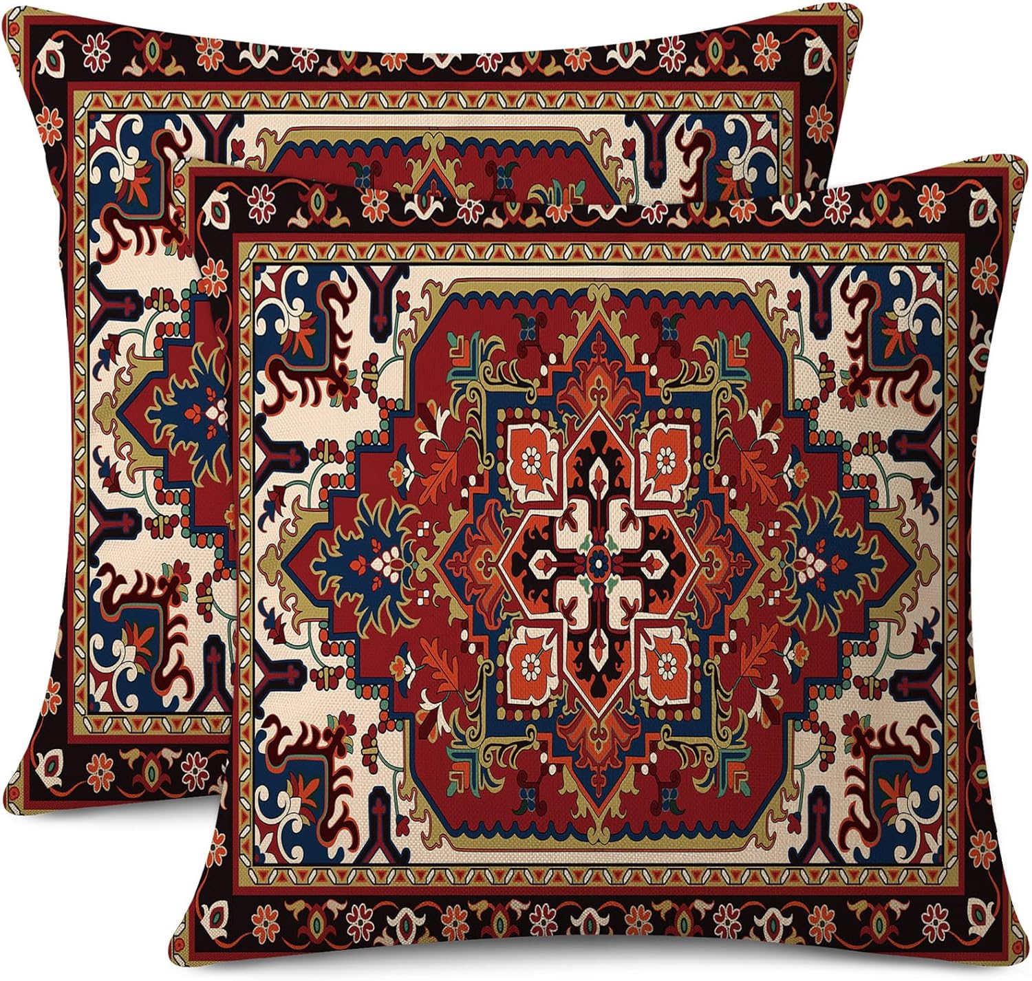 Outdoor Waterproof Pillow Covers 18x18 Inch Red Floral Bohemian Vintage Carpet Pattern Ethnic Design Decorative Farmhouse Cushion Cases for Sofa Couch Garden Balcony Set of 2