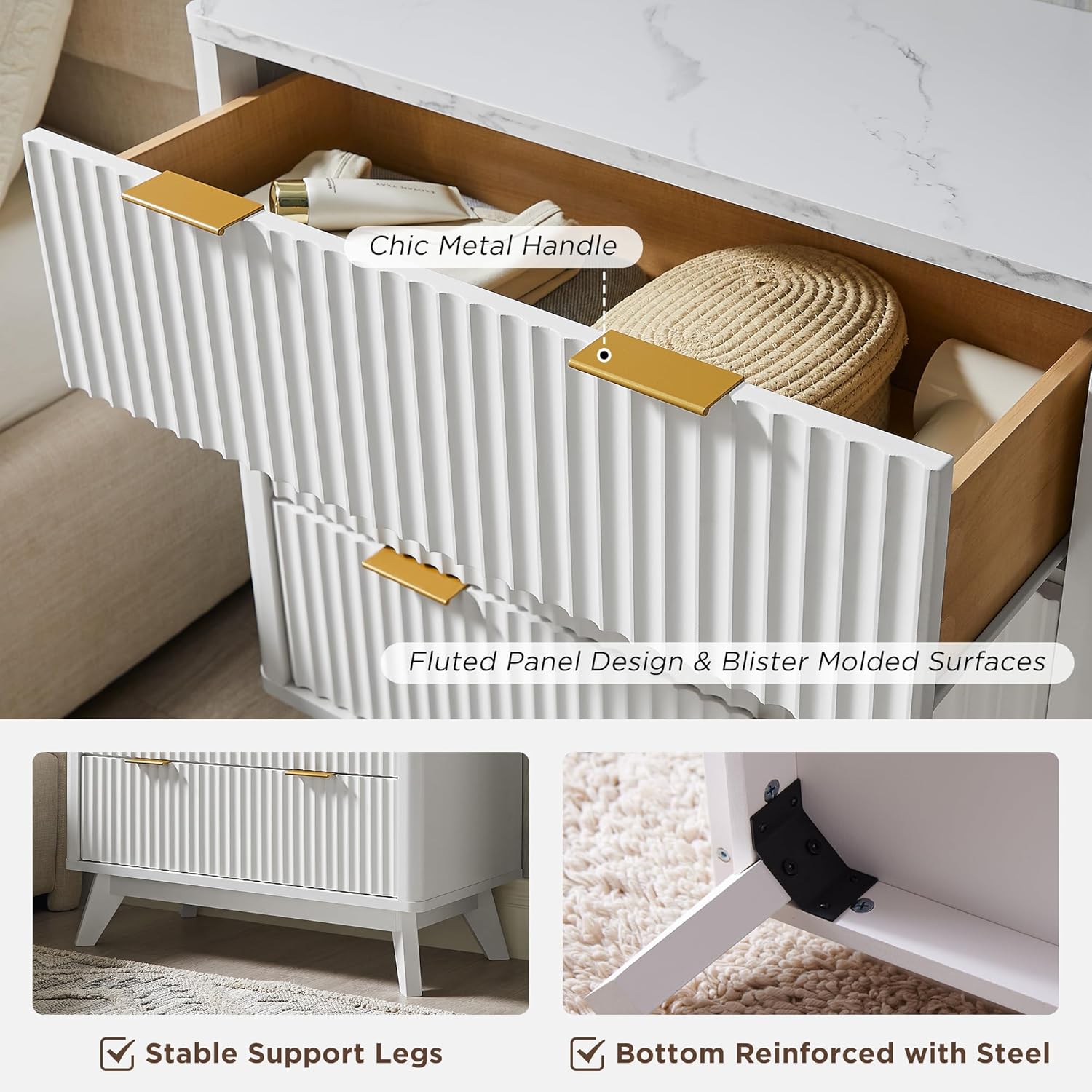 - Stable, Durable and Textured: Made from FSC-Certified wood, optimal MDF, P2 engineered wood. Specially, the fluted panel uses blister molding tech, and the faux marble top is made of melamine veneer, which not only has exquisite texture, but also ensures long-lasting durability, water resistance, and easy maintenance. Notably, the cabinet's stability is reinforced by the innovative inclusion of a steel support at the base, guaranteeing a reliable and sturdy piece of furniture.