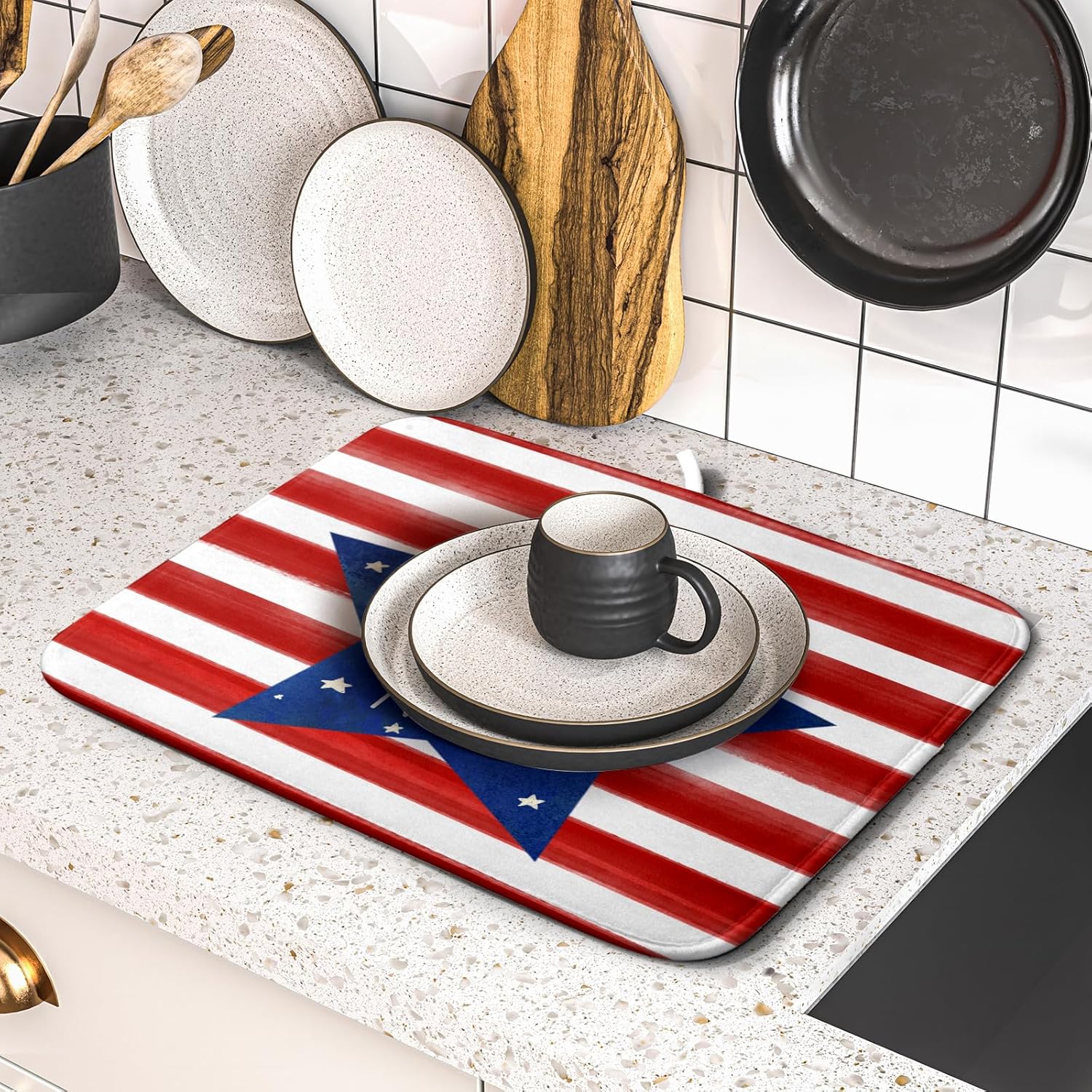 - 【Perfect Size】This patriotic dish drying mat measures 16 x 18 Inch. Fits most kitchen countertops,while providing a smart,sharp look.