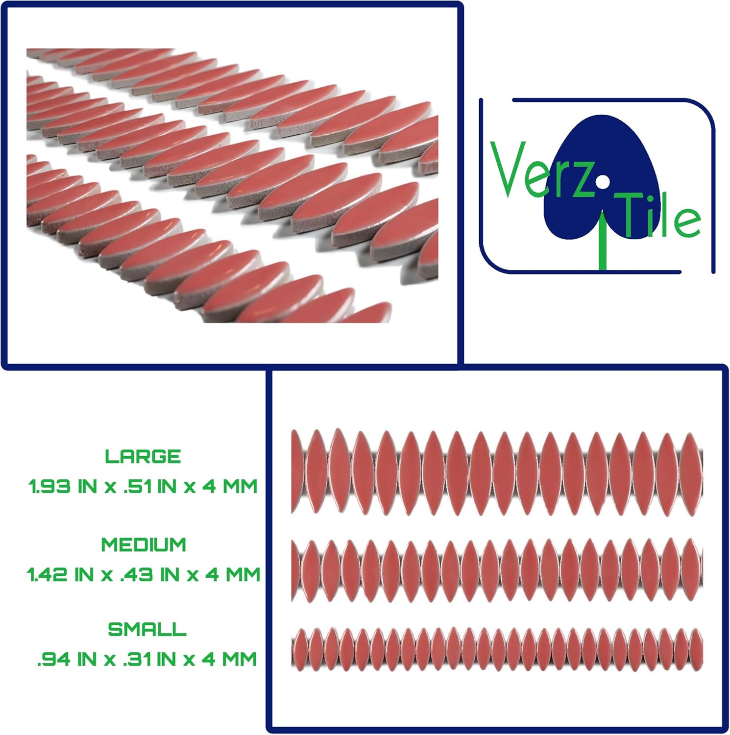 - High Fired Equals Durability; Ceramic Mosaic Tiles are Water Resistant with a Shiney Glazed Finish; Mosaic Pieces in 3 Sizes; Small Tiles(.94in x .31in or 2.4cm x 0.8cm) Medium (1.42in x .43in or 3.6cm x 1.1cm) Large (1.93in x .51in or 4.9cm x 1.3cm); Thickness 4mm