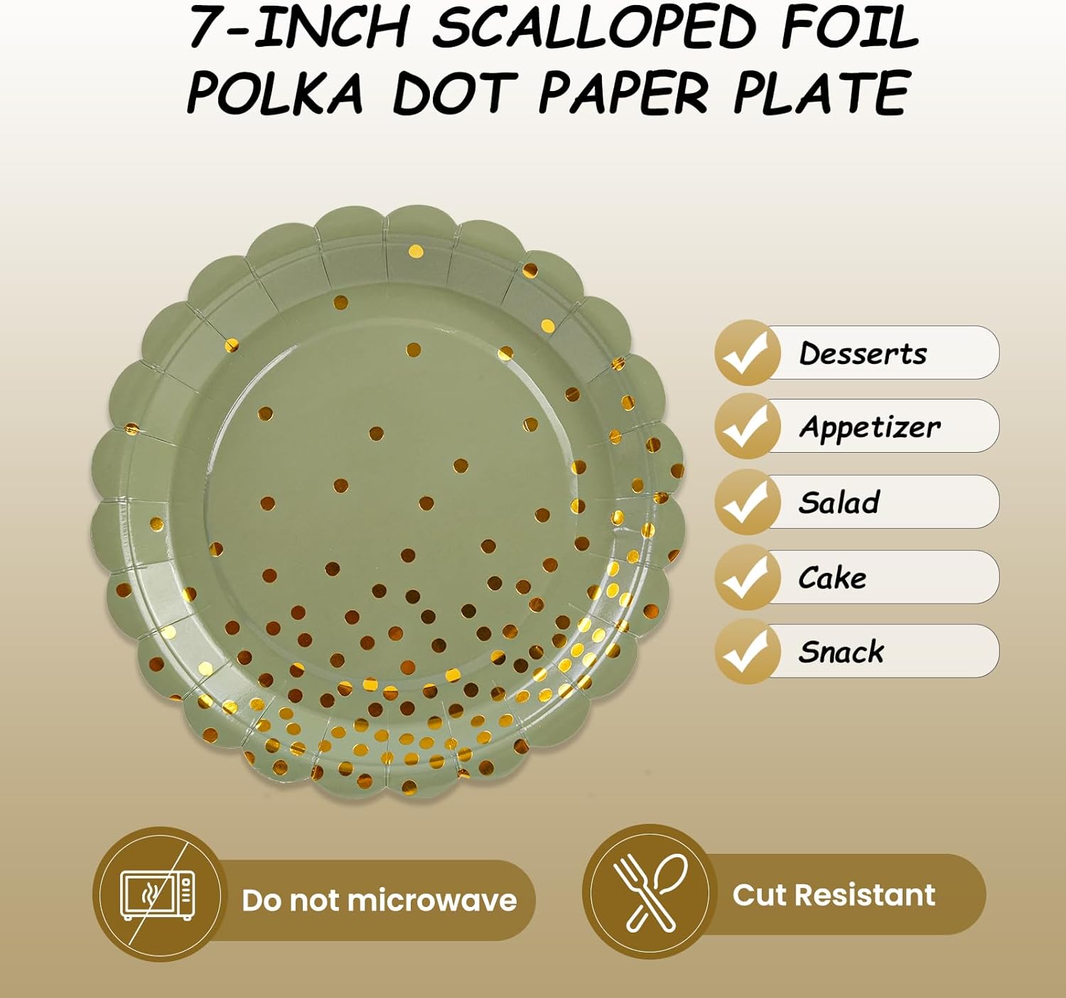 50PCS Sage Green Paper Plates, 7 Inch Scalloped Green and Gold Party Plates Disposable Foil Polka Dots Dessert Plate Cake Plate for Birthday, Baby Shower, Wedding, Bridal Shower St Patricks