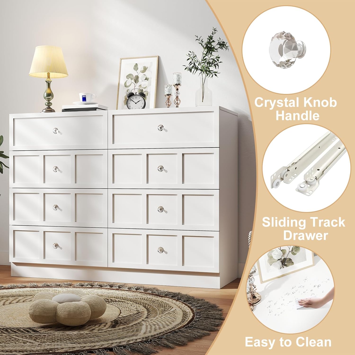 - Premium Materials Crafted for lasting quality, our 8 drawer white dresser for bedroom features high-grade engineered wood with a specially treated surface that's scratch-resistant and easy to clean. A simple wipe restores its pristine finish. The fluted 8 drawer dresser showcases crystal knobs that combine elegant design with satisfying tactile feedback, making every use a pleasure.