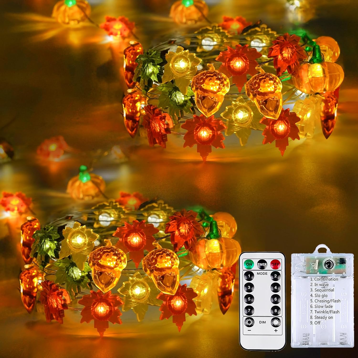 - Remote Control& 8 Modes& Timer Function: These Thanksgiving lights offer 8 modes, switched on the battery box or by remote. Using the remote control you can also set the brightness level (10 levels) as well as set the auto-timing(6/18 hrs).These string lights can rememer the setting you chose the night before.