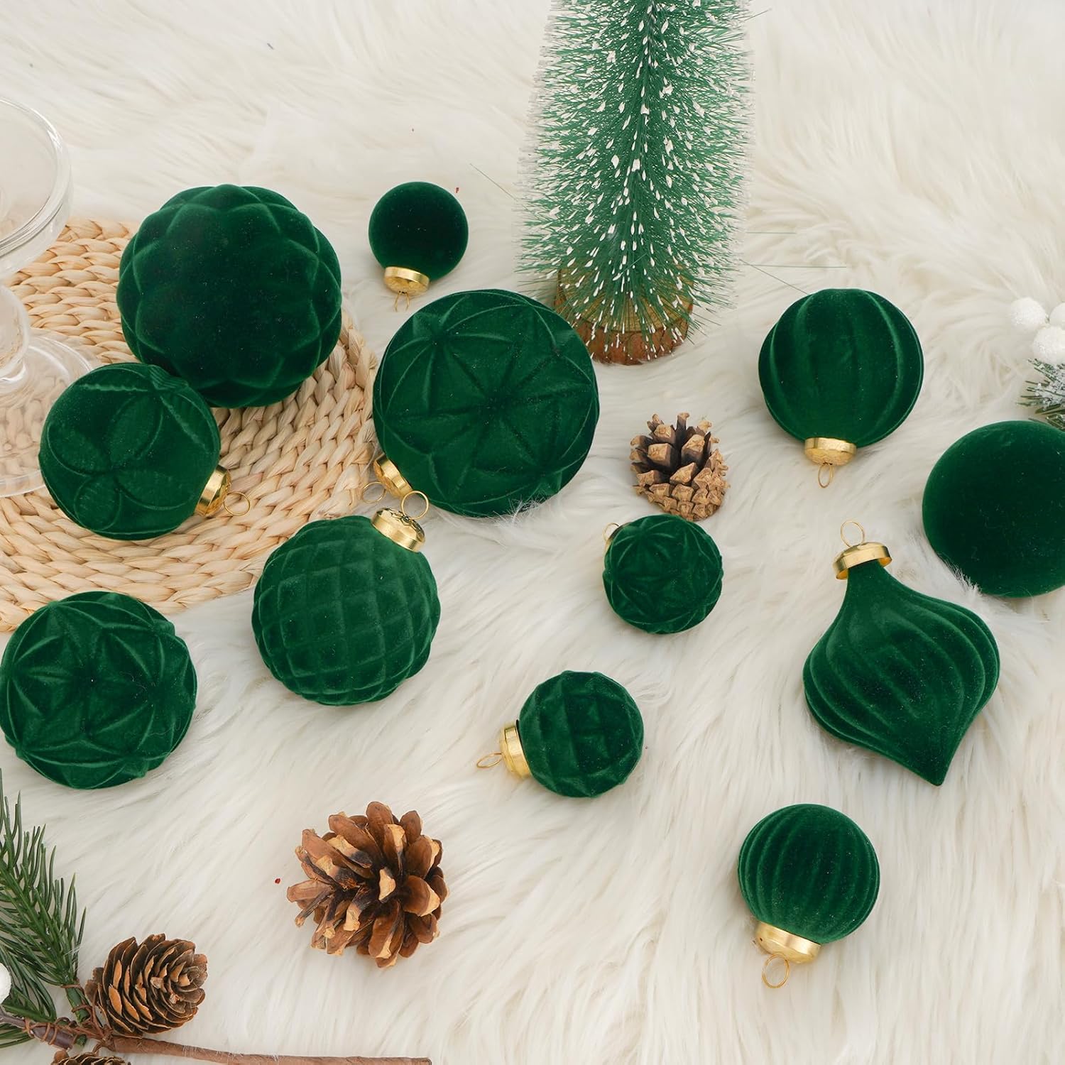 46PCS Velvet Christmas Ball Ornaments Set, Flocked Shatterproof Xmas Tree Decor, Assorted Hanging Ornaments with Loop for Holiday Home Decor, Christmas Tree, Mantel, Party Decoration (Green)