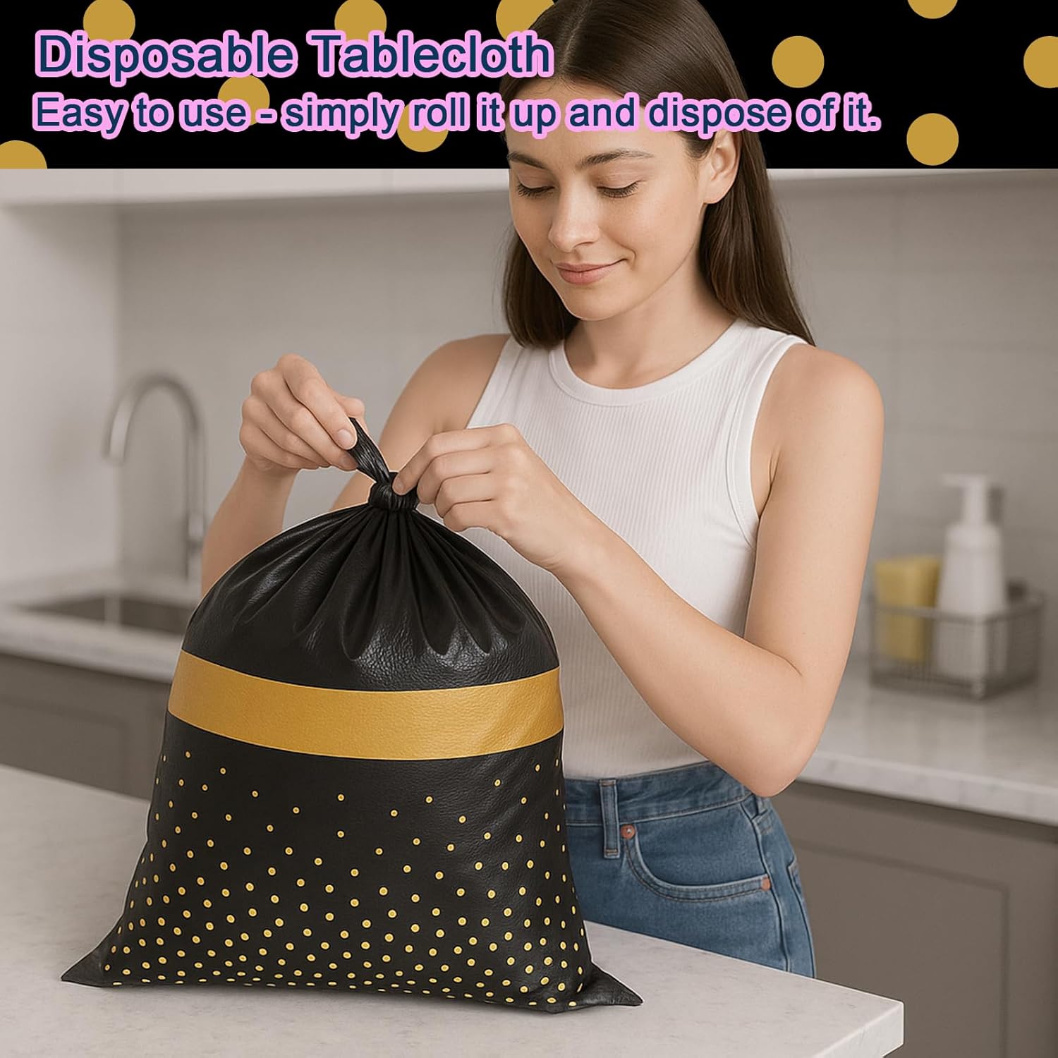 - Fashionable Metallic Design: These disposable tablecloths feature a sophisticated black background adorned with shimmering gold speckles. The stylish black-and-gold pattern instantly elevates your tablescape, creating a polished yet welcoming atmosphere that will make your gatherings truly unforgettable for family and friends.