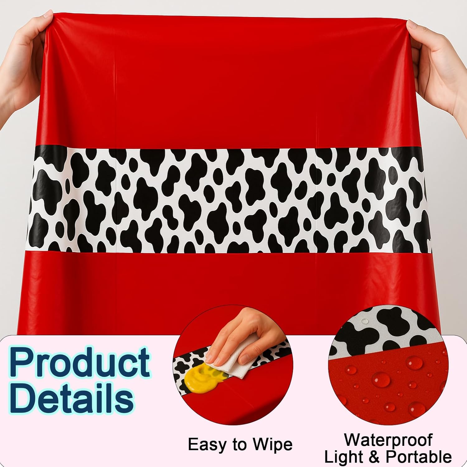 - Cow Print Tablecloth Set: You'll get 6 charming Red cow-print table covers, each measuring 108" x 54" (274 x 137 cm). Perfectly sized for 8-foot tables seating 8-10 guests, this generous set ensures you're always prepared for any festive occasion.