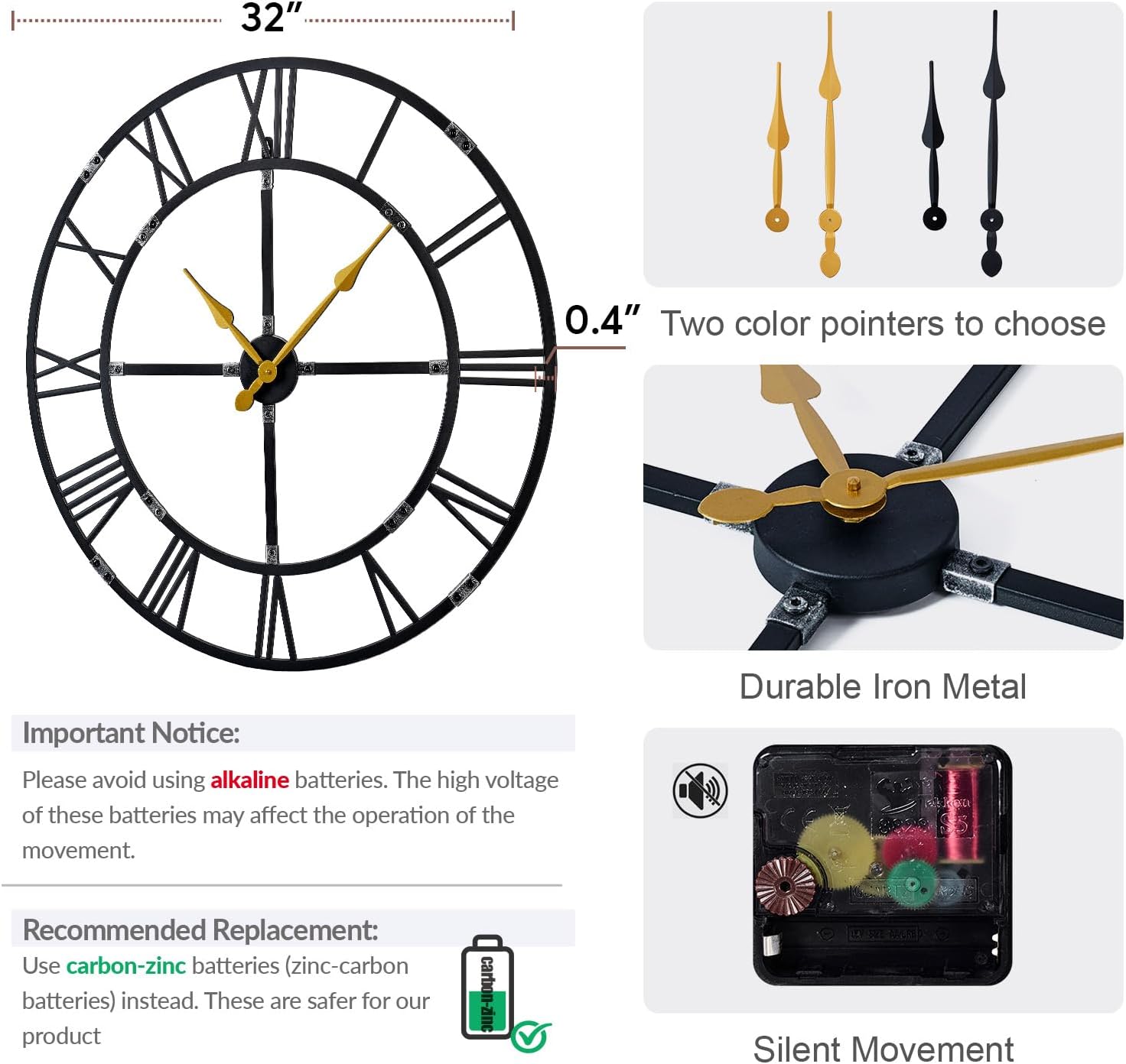 - Oversized Modern Design – This large wall clock features a minimalist open-face design with Roman numerals and black metal craftsmanship, making it a stunning decorative wall clock for living room, entryway, or office.