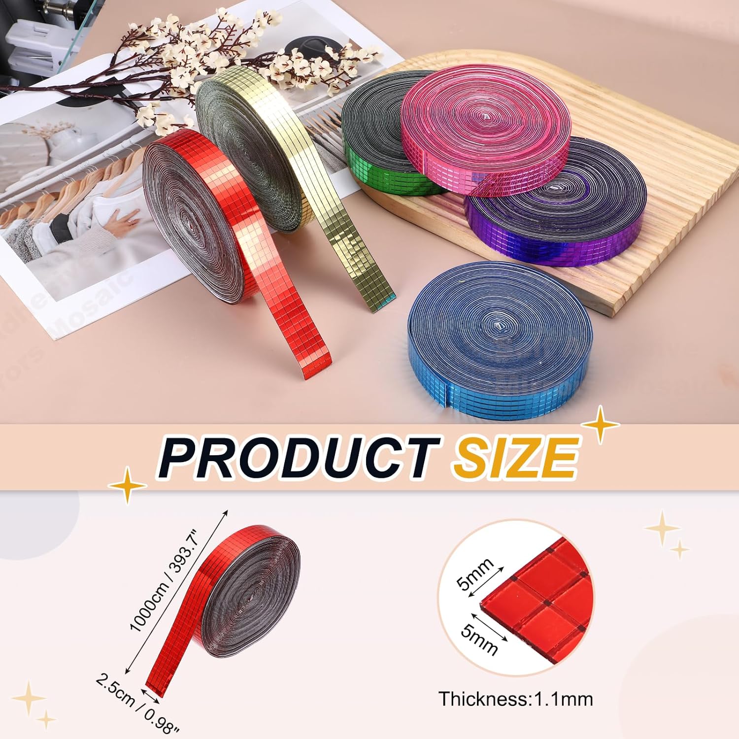 - Specification: Color: Red; Material: Glass; Size:1000x2.5cm/393.7x0.98Inch(LxW); Thickness:1.1mm/0.04inch; Each Tile Size: 5x5mm/0.2x0.2inch; Packing List: 10000 Pcs x Self Adhesive Mirrors Mosaic Tiles (Roll of 1)