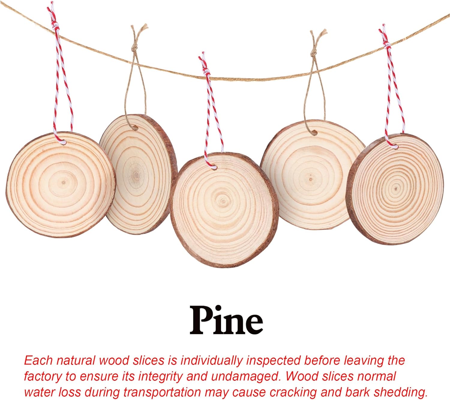 - Premium Quality wood slice: The wood slice are made of pine wood with a sturdy structure, durable and detailed grain, after natural air-drying and sanding treatment, the surface of the wood chips is clear, smooth and burr-free, which makes them ideal for all kinds of DIY handicrafts. The perforated pieces of wood slice can be hung directly from the decoration to create unique small gifts with DIY creativity.