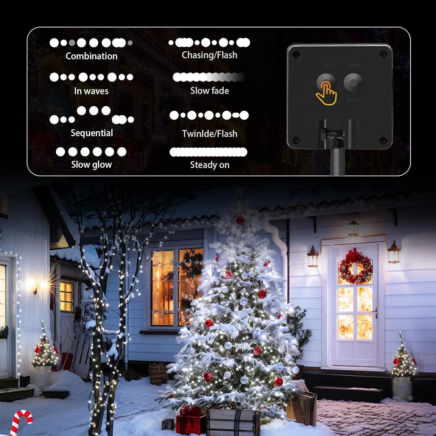 - 【8 Modes & Light Sensors】Press the mode switch, there are 8 different modes: Combination, Waves, Sequential, Slow Glow, Chasing/Flash, Slow Fade, Twinkle/Flash, and Steady on. The solar string lights for outside also have a memory function and will remember your last set of patterns. They feature light-sensing technology, which means they can automatically turn on at night. Now you don't have to reset it every day!