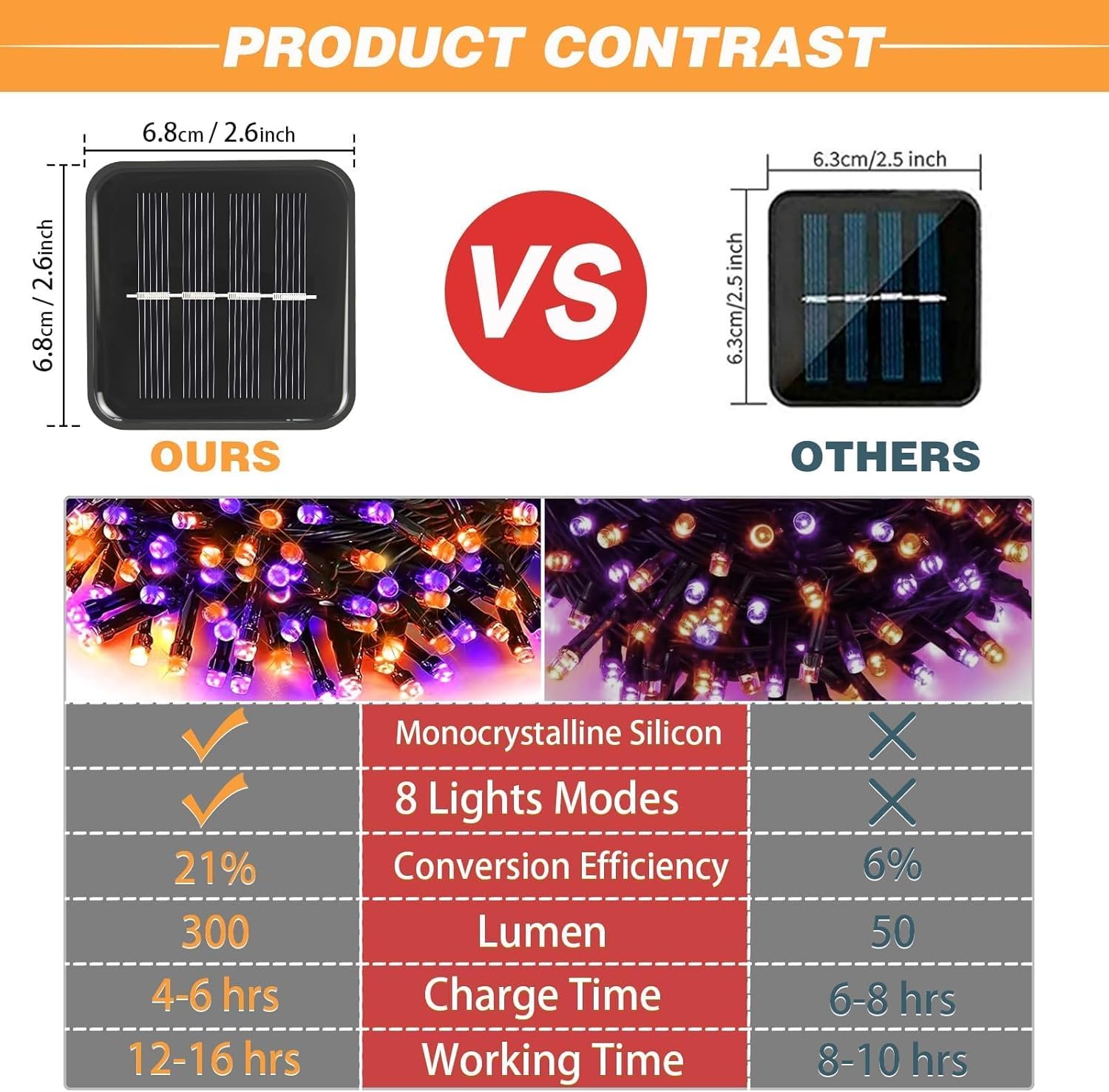 - ăAdvanced Monocrystalline Silicon & IP65 Waterproof LevelăSolar lights outdoor use more advanced monocrystalline silicon solar panels, which can receive, store and release solar energy more efficiently, and the solar energy conversion rate has increased by 21%. This means charging time is only 5-6 hours and battery life is up to 10-12 hours. The solar string lights outdoor waterproof up to IP65 waterproof rating, no need to fear any weather!