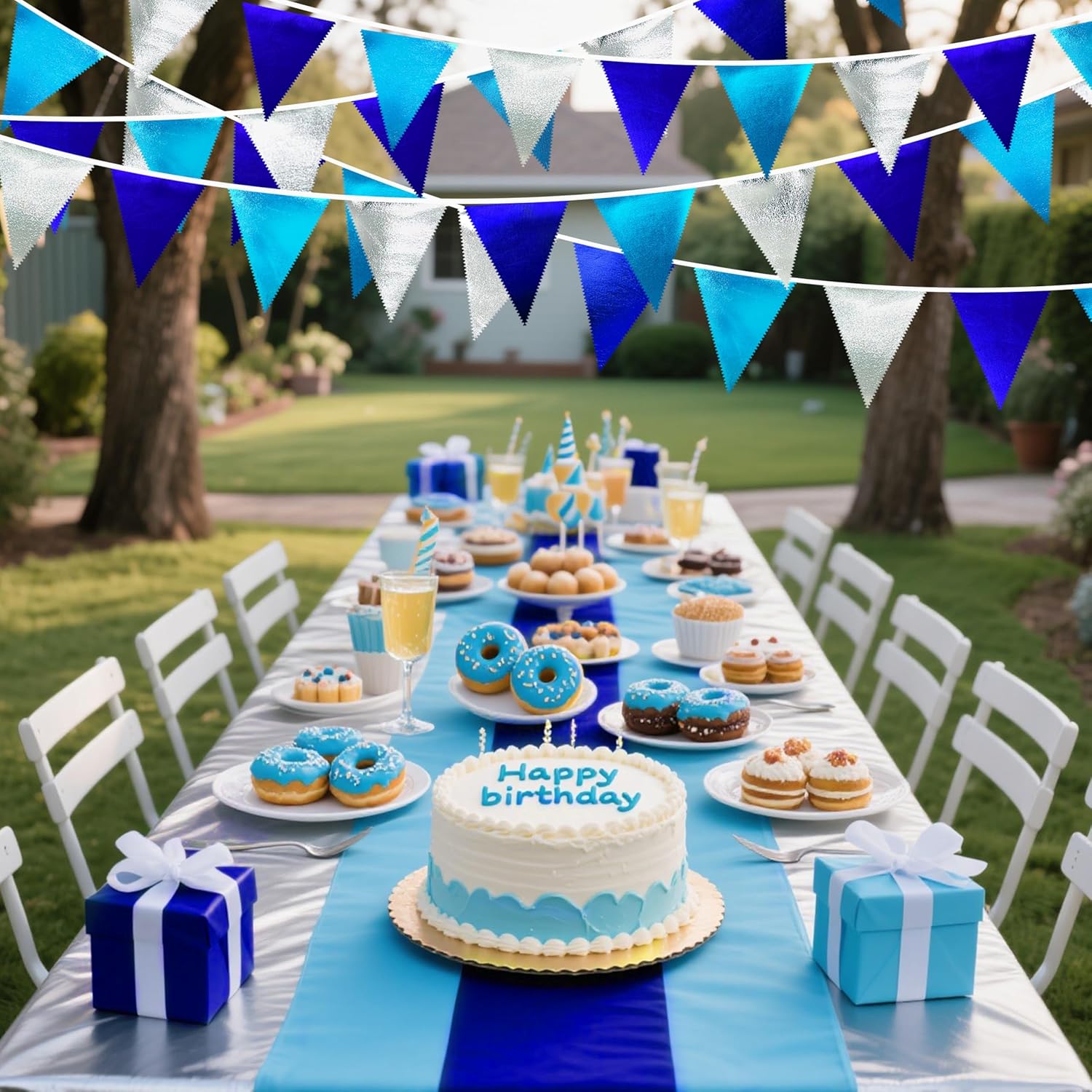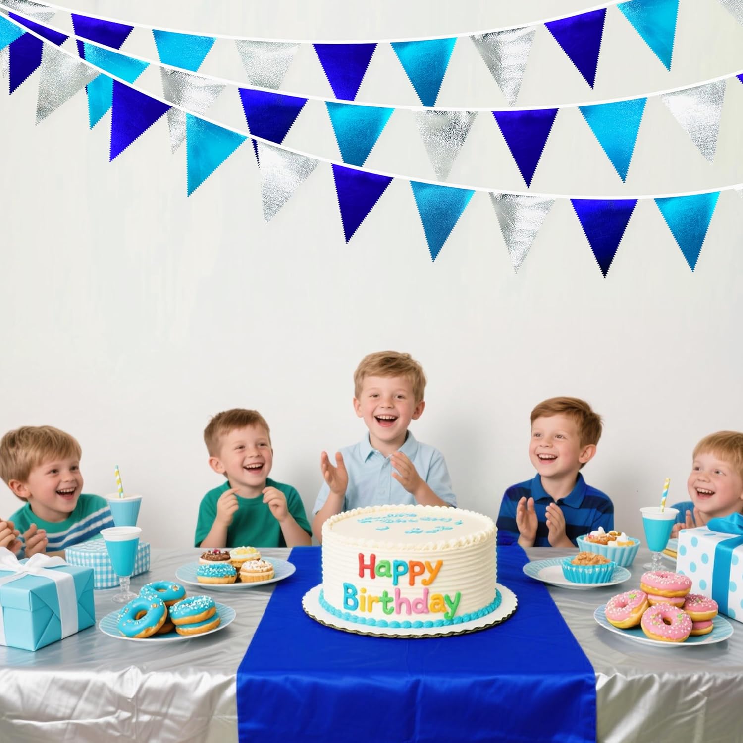- Environmental Material - Our triangle flag banner bunting are made of double-sided sky blueăroyal blueăsilve metallic fabric cloth,Unique wavy neat cut,soft and comfortable touch.safe and odorless,washable and waterproof,durable and reusable.