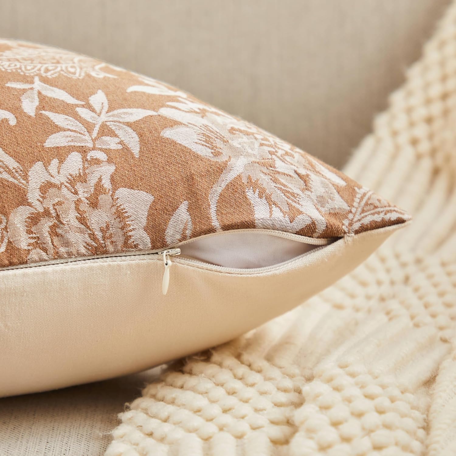 Floral Jacquard Throw Pillow Covers Set of 2, Background/Caramal 22x22 Inch, Farmhouse Decorative Cotton Caramal Cushion Covers for Sofa Bed Living Room Home Decor