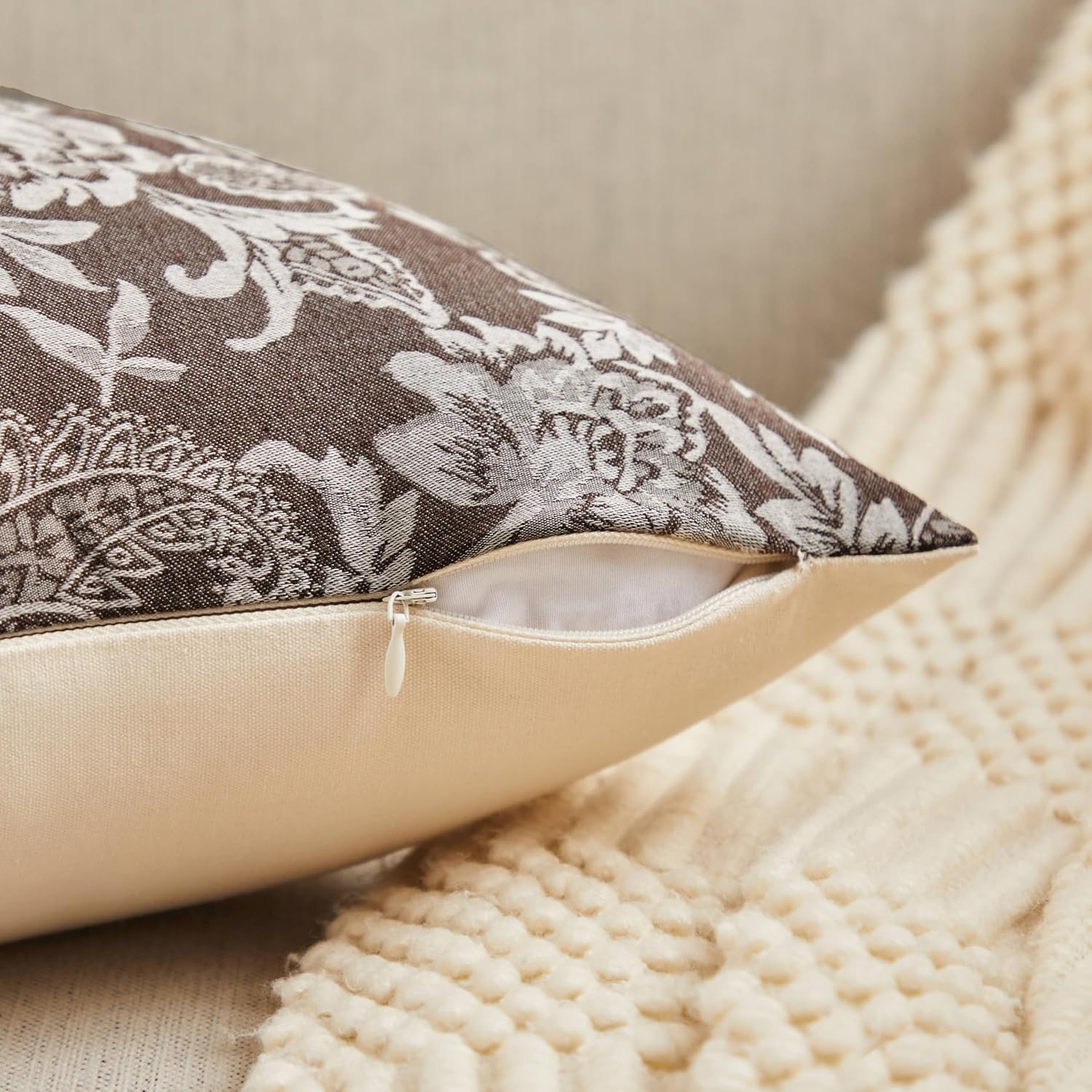 Floral Jacquard Throw Pillow Covers Set of 2, Background/Chocolate 18x18 Inch, Farmhouse Decorative Cotton Dark Brown Cushion Covers for Sofa Bed Living Room Home Decor