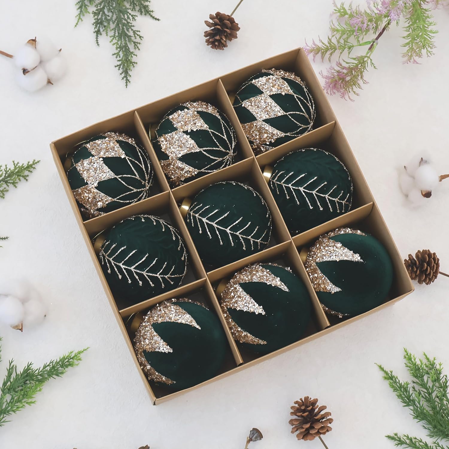 4inch Velvet Ornaments for Christmas Tree, 9PCS Glitter Flocked Christmas Ornaments Decorations Balls Set Decor Green