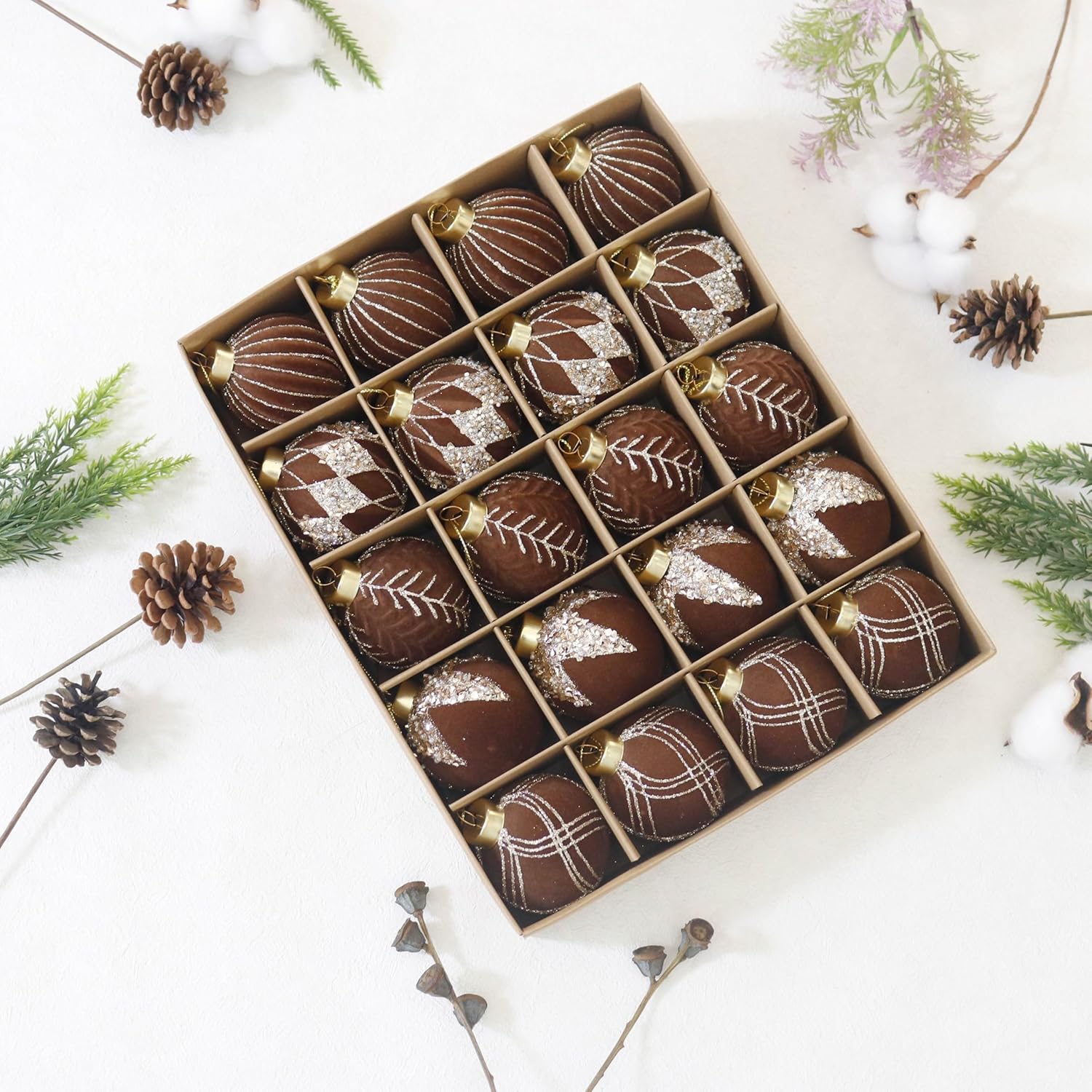 • Package List:the package contains 20PCS of flocked Christmas ball ornaments with glitter,2.36inches in diameter,solid color packed to choose,nice texture can fully meet your needs for decorating