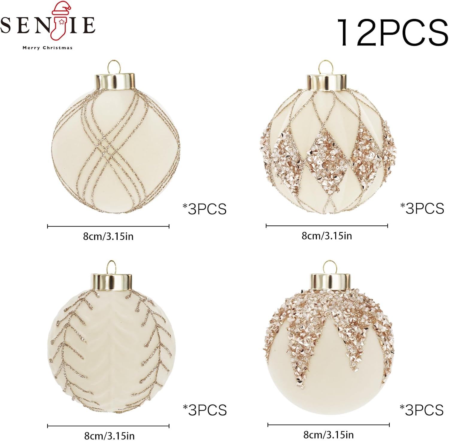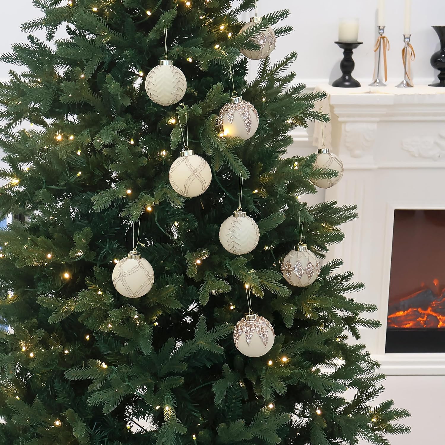 3.15INCH Beige Velvet Ornaments for Christmas Tree, 12PCS Glitter Flocked Christmas Ornaments Decorations Balls Set Decor
