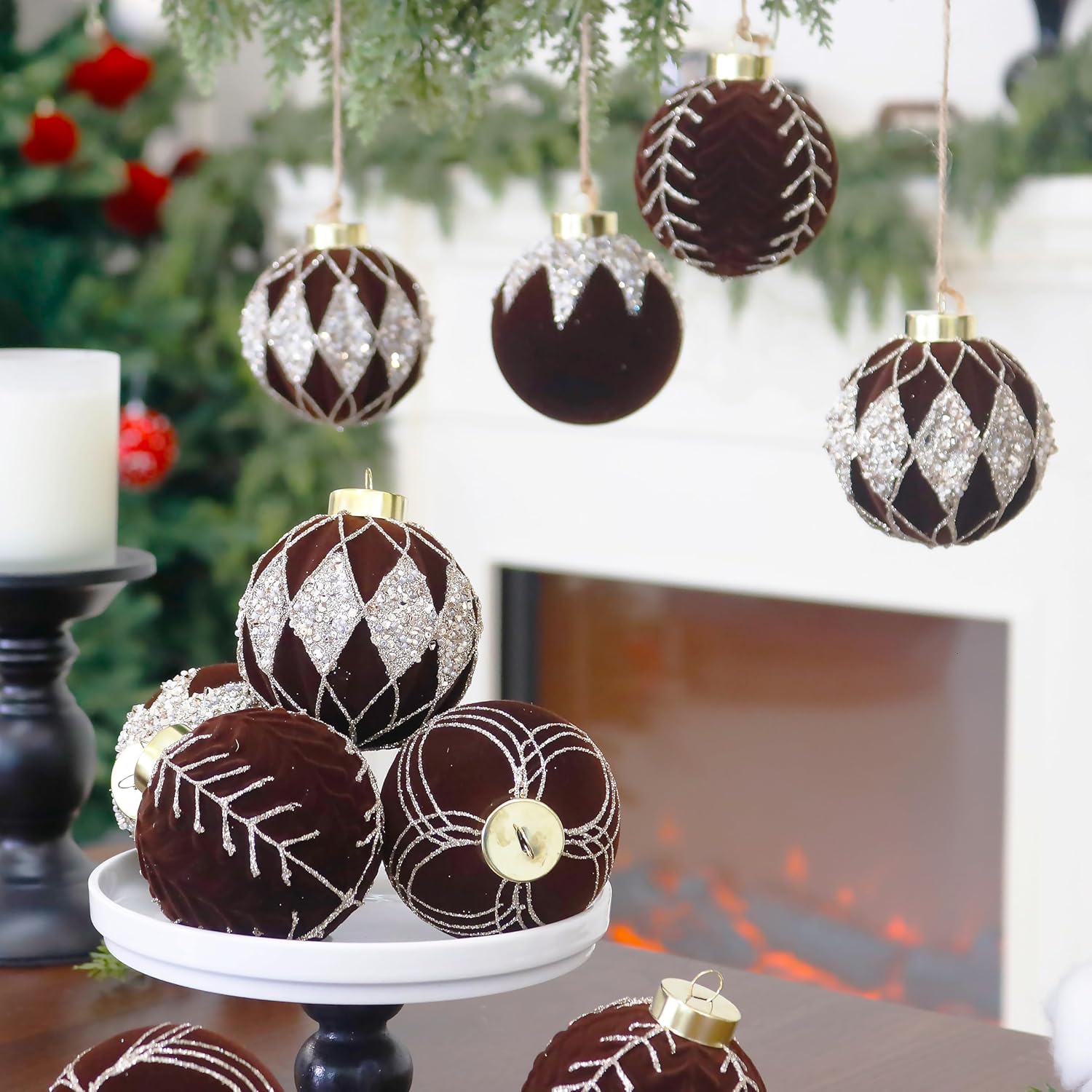 4inch Velvet Ornaments for Christmas Tree, 9PCS Glitter Flocked Christmas Ornaments Decorations Balls Set Decor Brown
