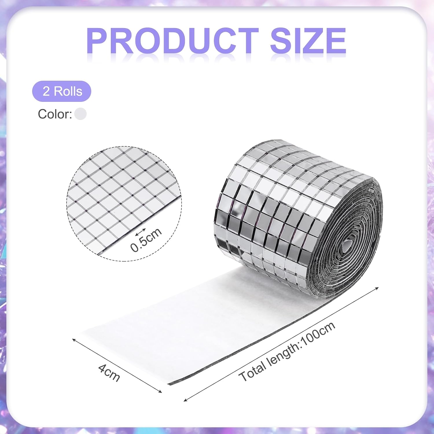 - we provide here, are in the size of: Size: Each roll measures 4 x 100cm (total 2 meters) ; Material: glass with strong adhesive backing ; Color: 2 roll of Silver (total 2 rolls) ; In the package of: 3200 Pieces Adhesive Mosaic Tiles 5 x 5 mm Disco Tiles 2 Rolls (Silver)
