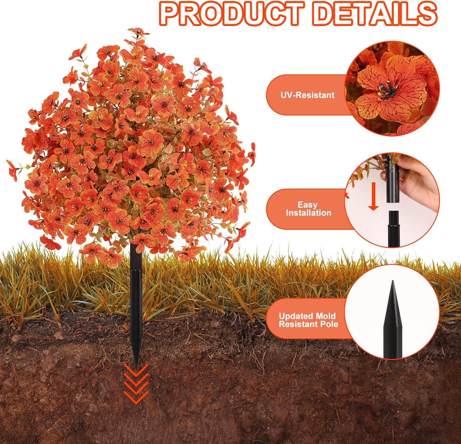 - đăAll-Weather Durabilityă The 6.1-inch extra-long ground stakes securely anchor these 2pcs all-in-one fall floral bushes deep into soil, keeping them standing strong through heavy winds and storms. These durable artificial autumn shrubs are built to withstand any outdoor environment, season after season."